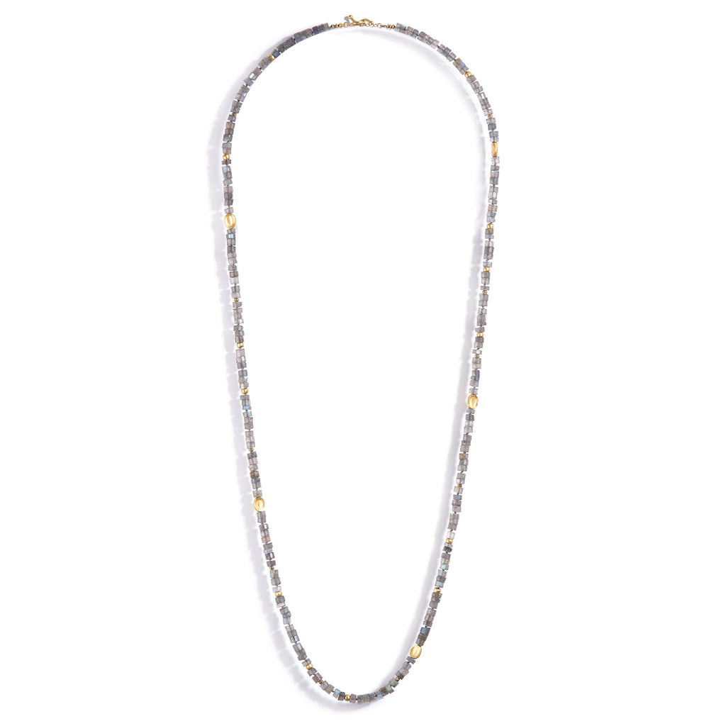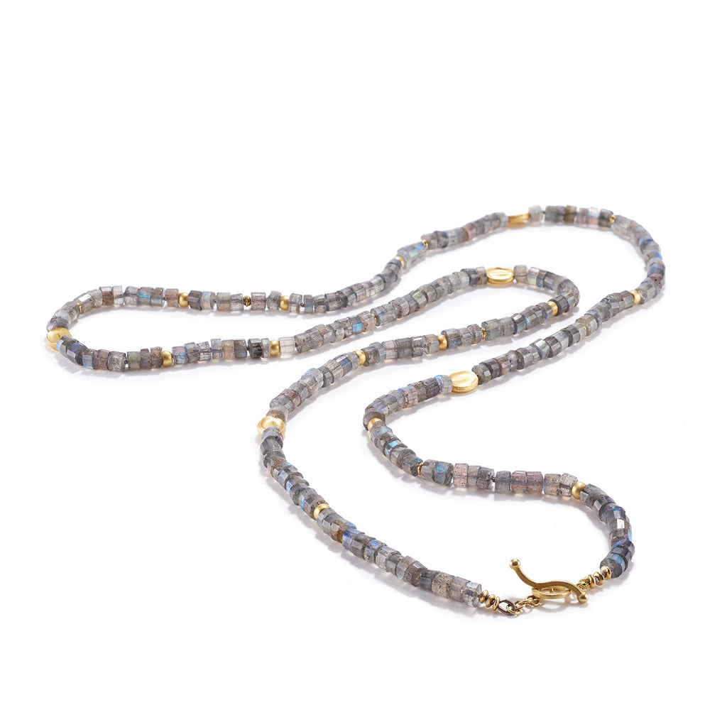Luminousity will reflect on and from you, with this lovely labradorite necklace around your neck. These stones hold all the pleasures you will need to surround yourself in iridescent blue/green love. Its labradorescence is reflected with every move you make in different parts of these wheel shaped stones.