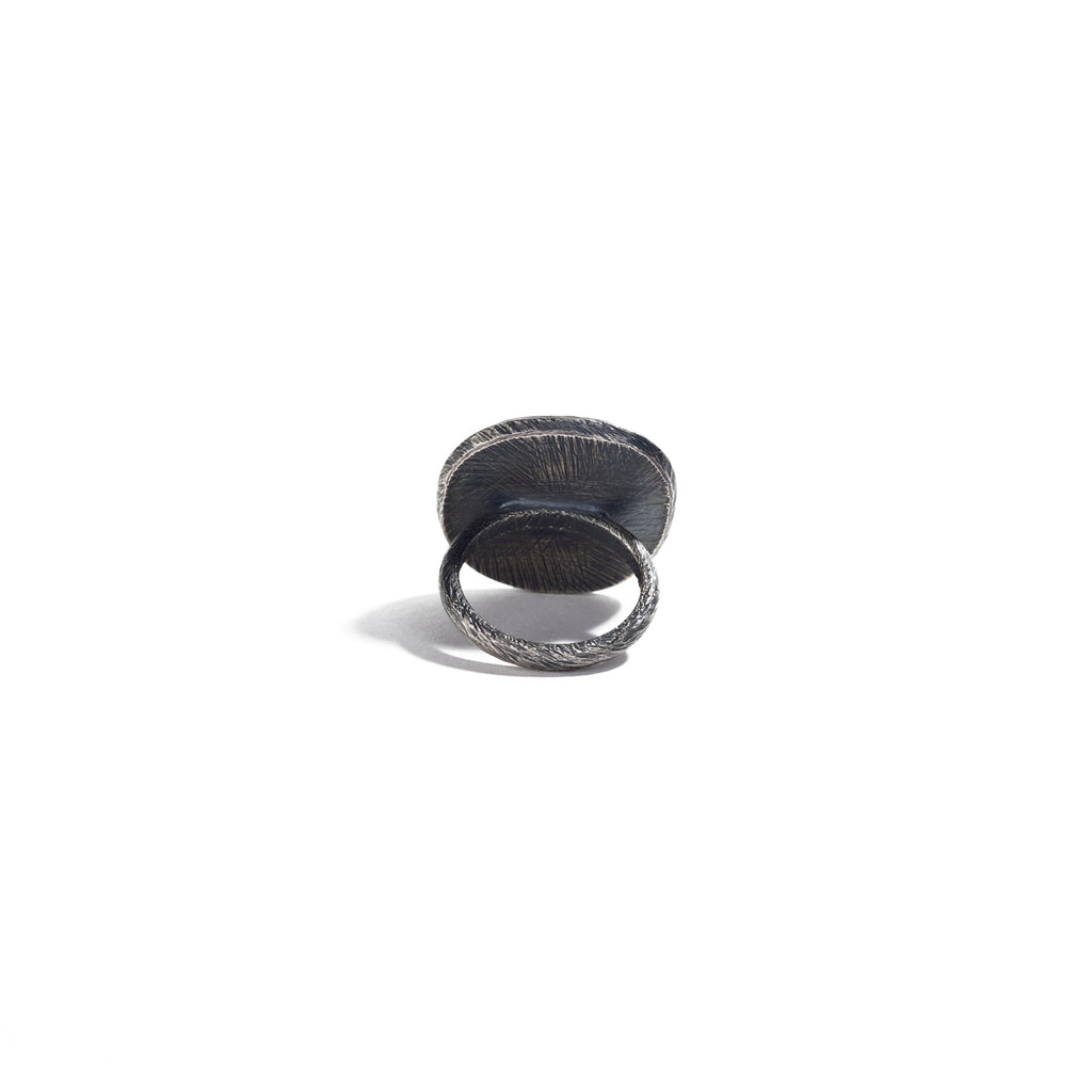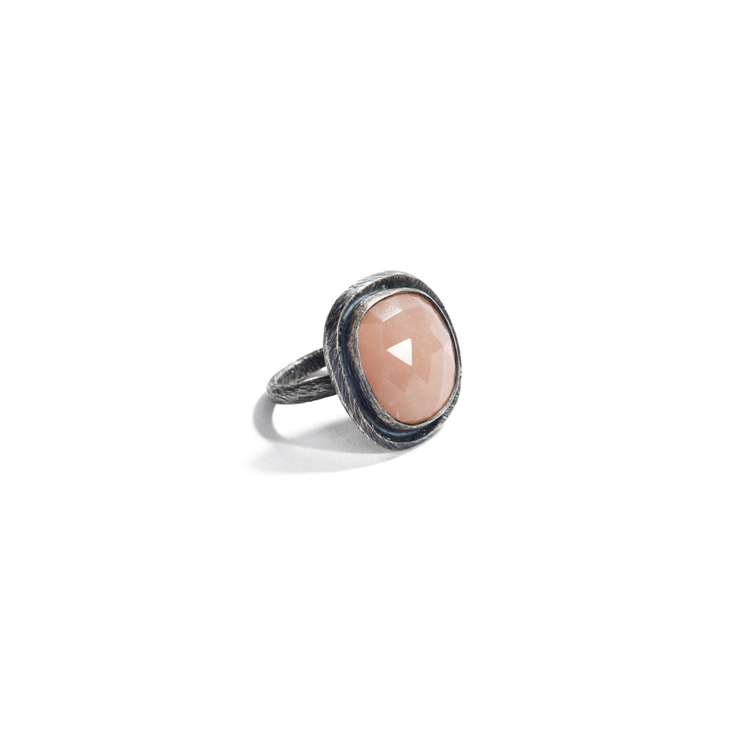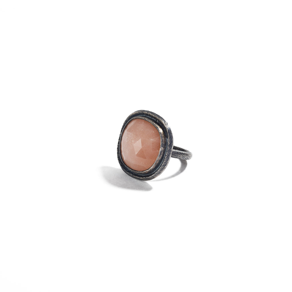Heather’s rings are completely hand-fabricated and inspired by the stones that she selects. This oxidized sterling silver ring is accented with her signature carved texture, and features a frame around the bezel setting that echoes the shape of the peach moonstone.