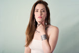 As shown with: Rose Quartz Cuff, Peach Moonstone Necklace, Jasper Fringe Earrings, and Oxidized Peach Moonstone Ring.
