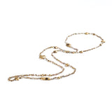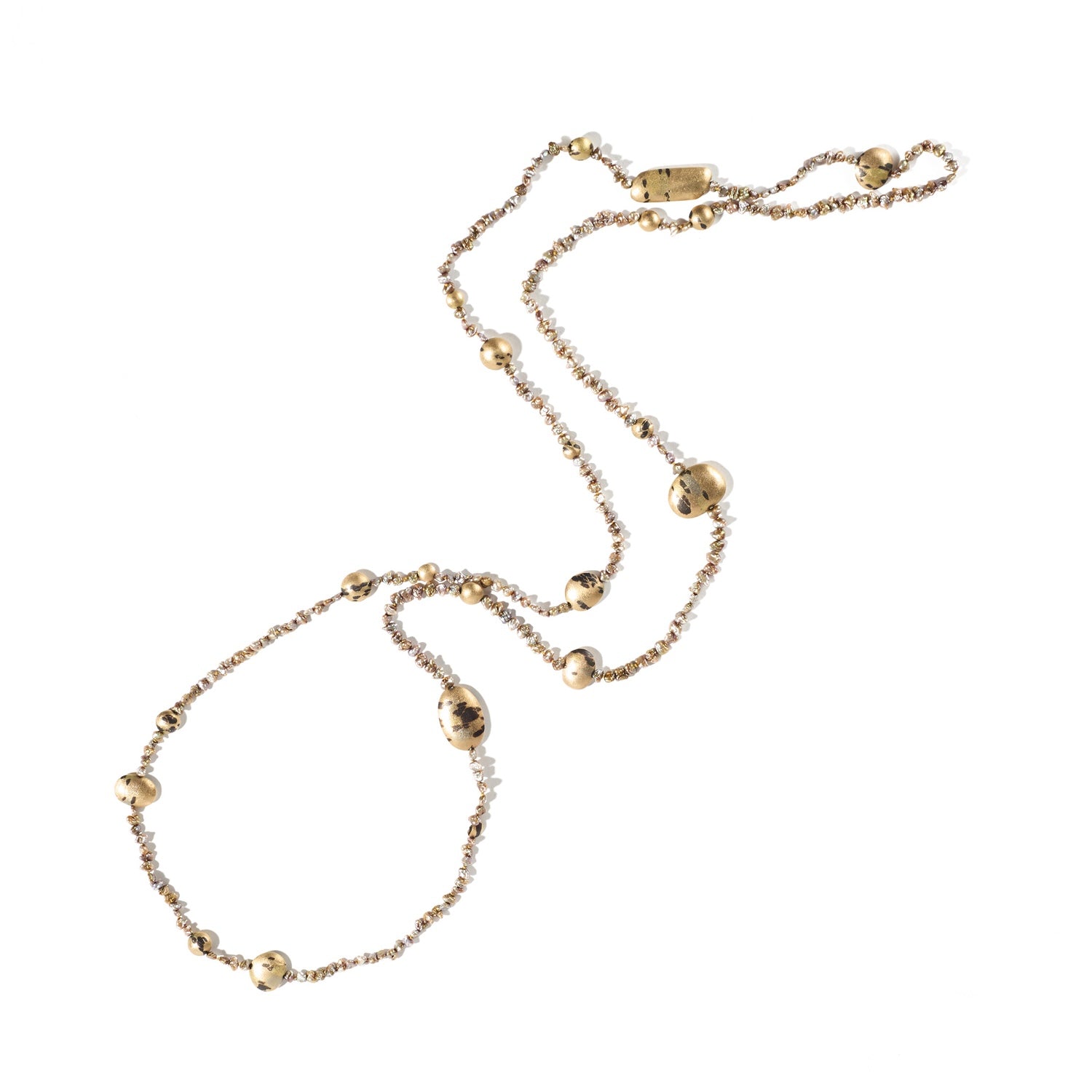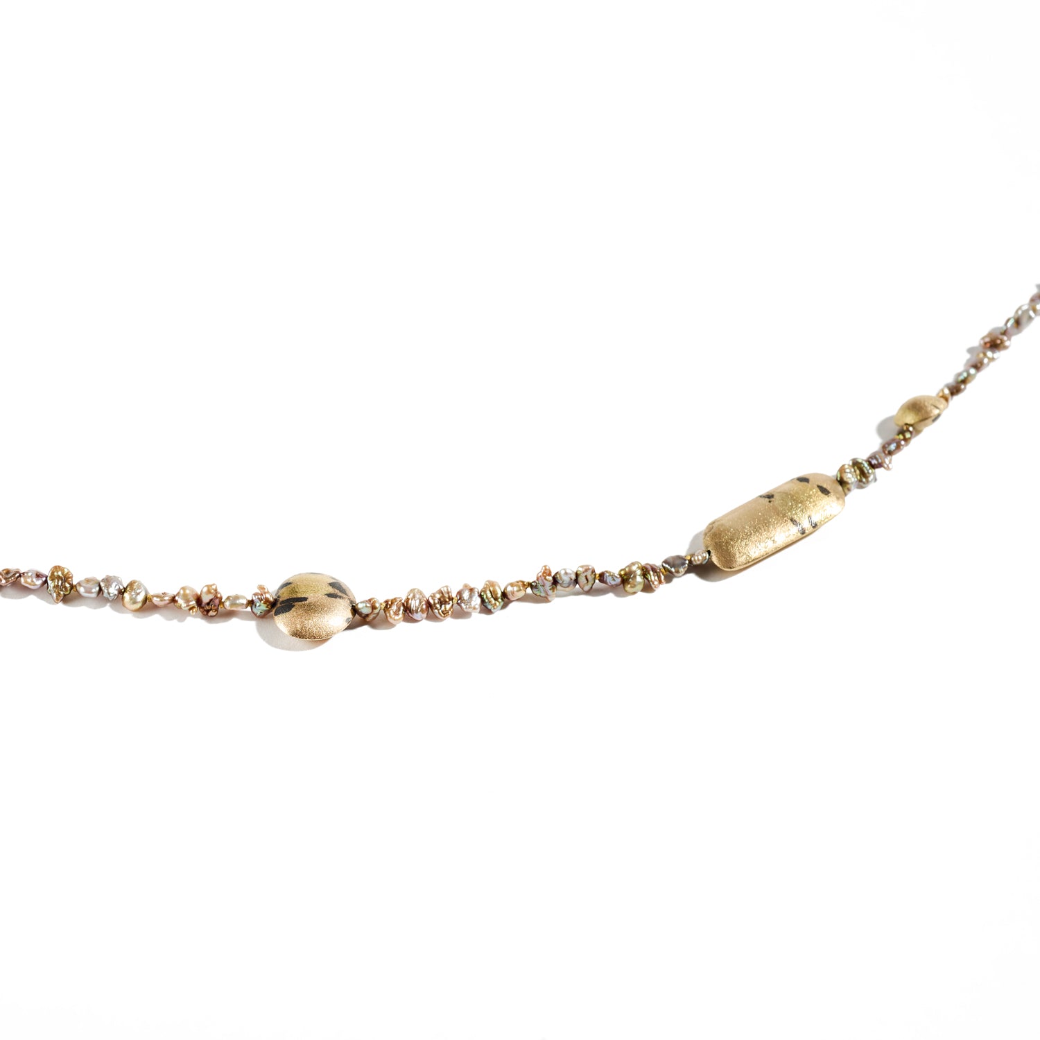 Twenty-one touchstones adorn this long strand of freshwater pearls, giving added meaning to this lariat. For Adell, her touchstones had great meaning, meant to resemble precious pebbles and rocks, Adell made each stone by hand, comprised of two sheets of metal using several techniques of marrying shakudo with gold to make poetic pebbles that grace this necklace and every piece in our Contemporary Estate collection.