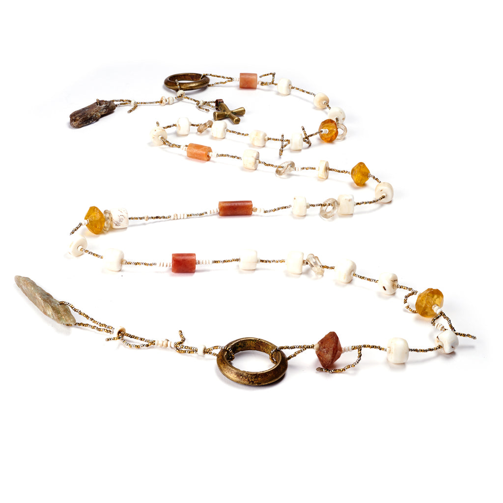 Antique Tibetan shell, antique Mali carnelian, antique African glass, kyanite, antique Ethiopian brass rings & cross, antique French brass beads