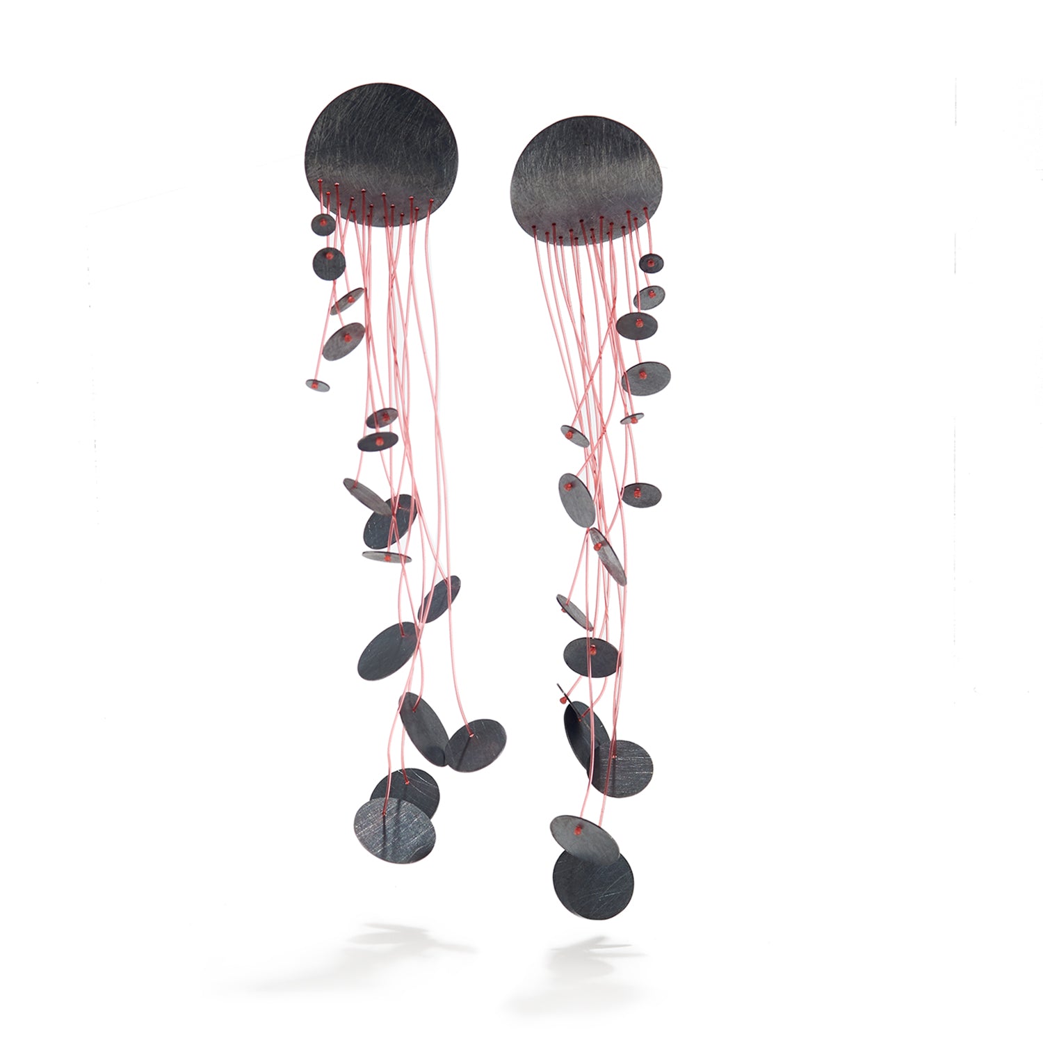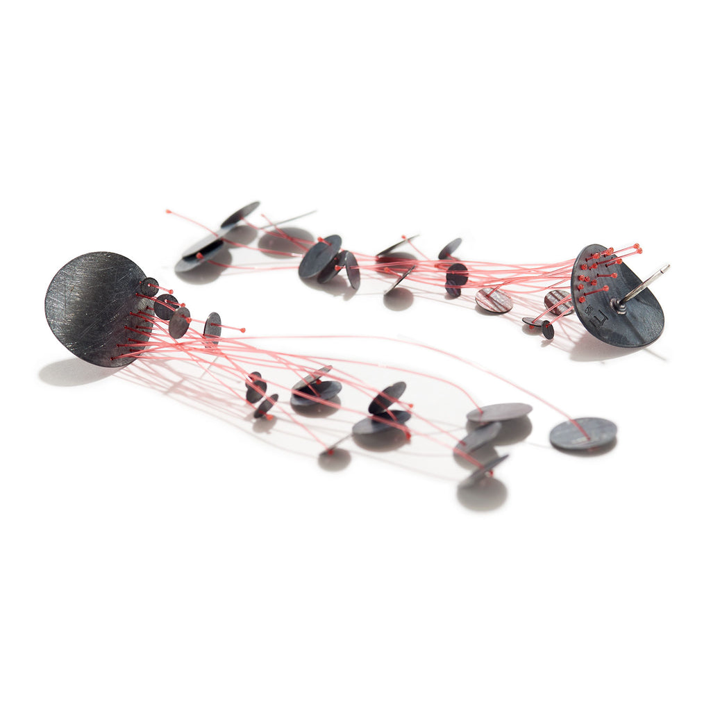 A flexible, fluid composition of abstract persuasion. Energized adornment in supple proportion, the nylon is positioned in graceful balance to the grander silver head of the piece. Its extended form seamlessly floats and fluctuates. The earrings, while lightweight, are a dynamic composition, balletic upon the lobe, yet as striking and ever present as a freestanding sculpture. An effective statement for any soul-stirring engagement.