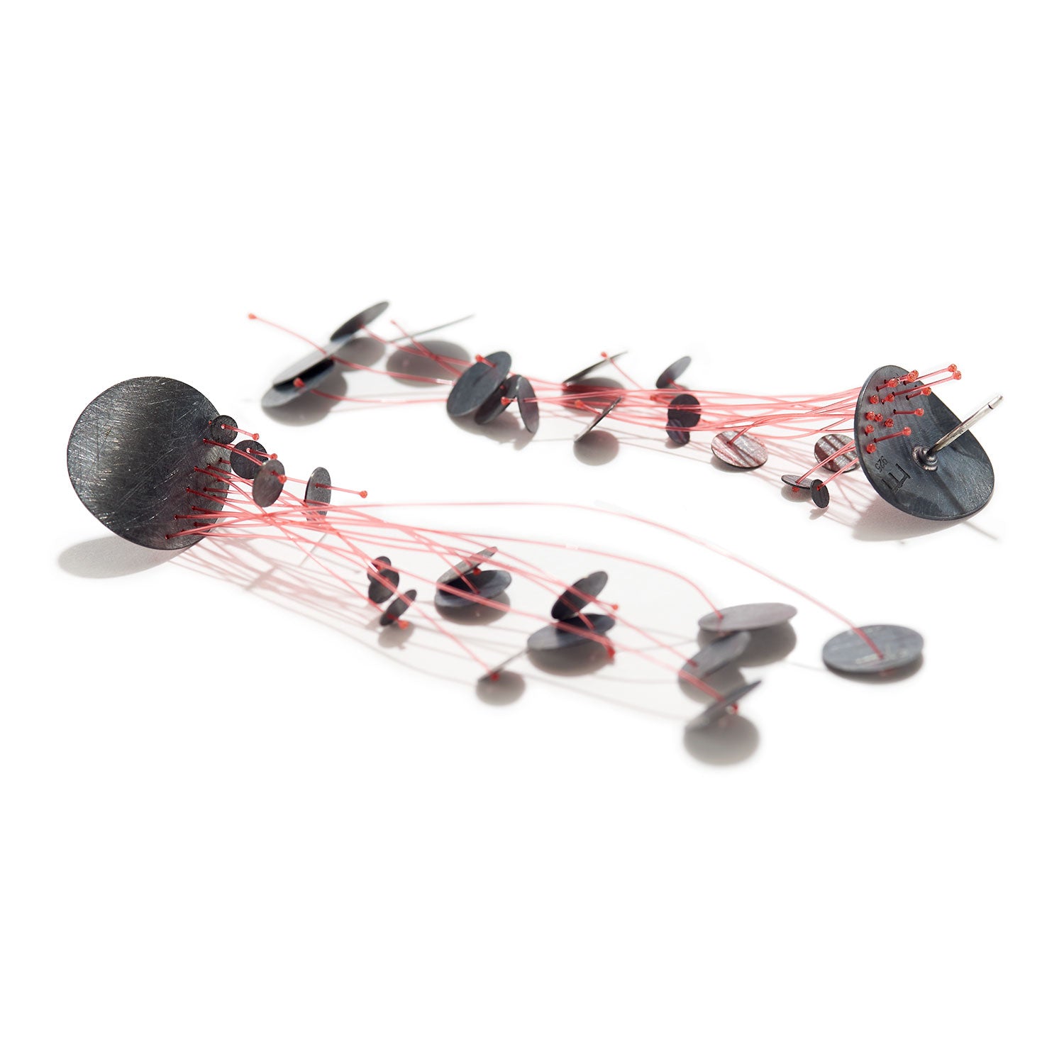Oxidized sterling silver, red nylon thread