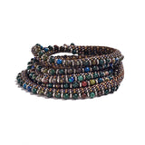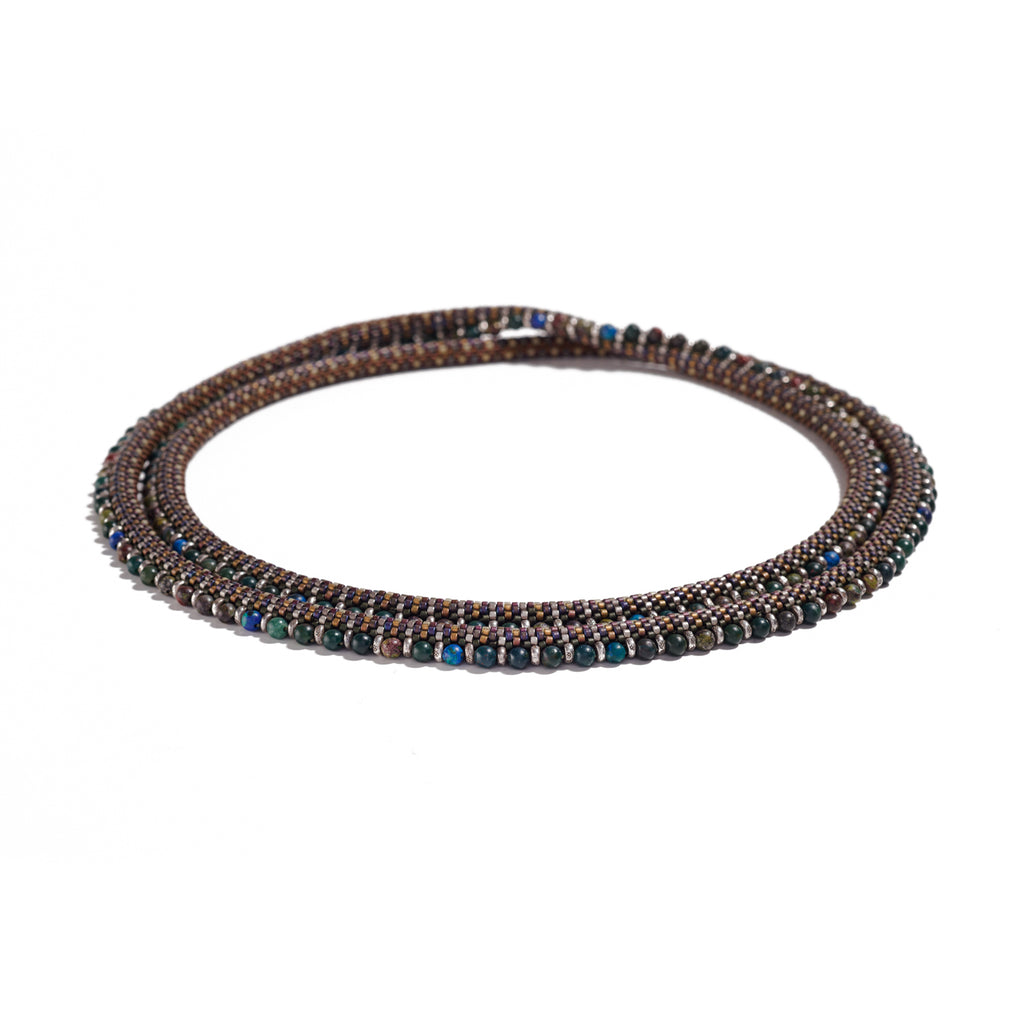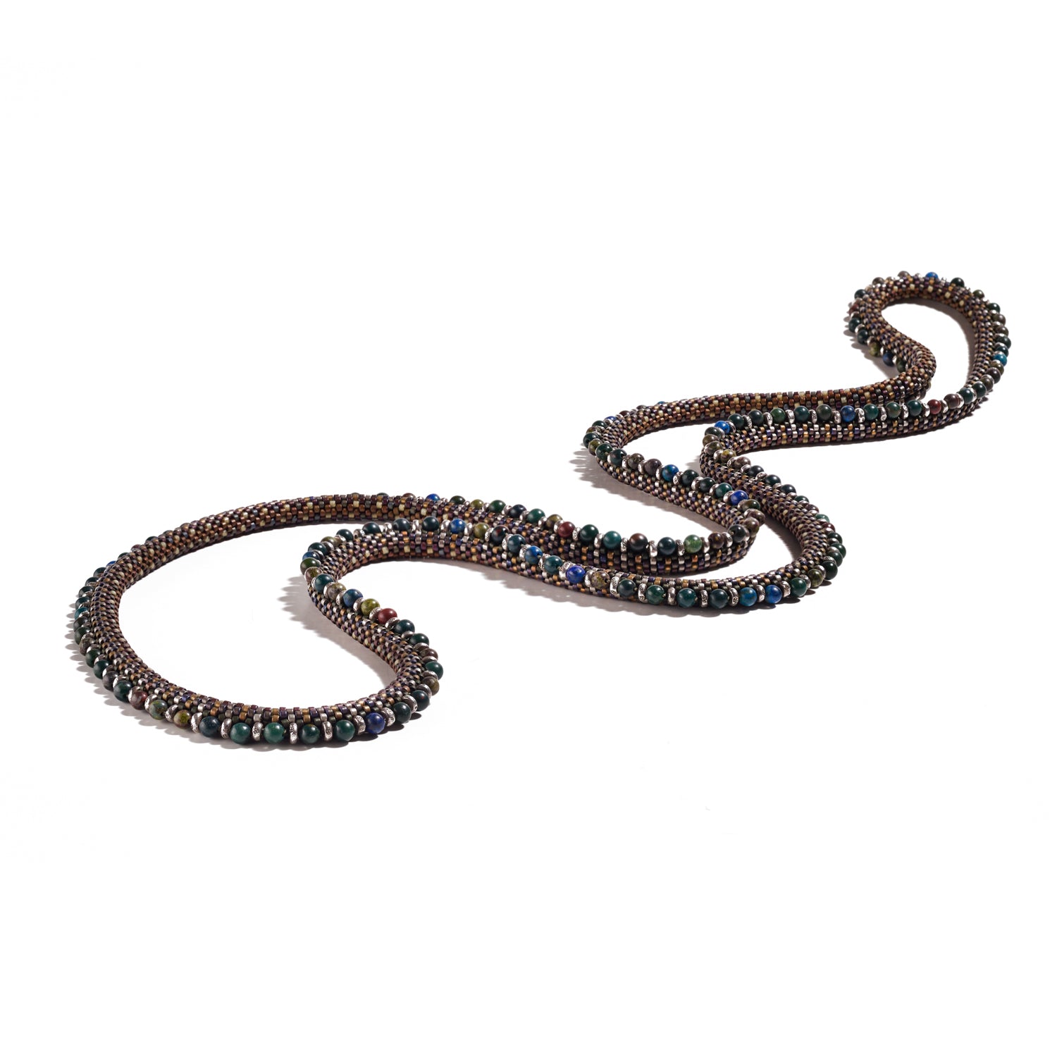 Lyda pattern in white, silver, grey, gold, bronze, metallic red and metallic olive-green with a line of round dragon jasper, lapis lazuli, and chrysocolla beads alternating with tarnished silver.