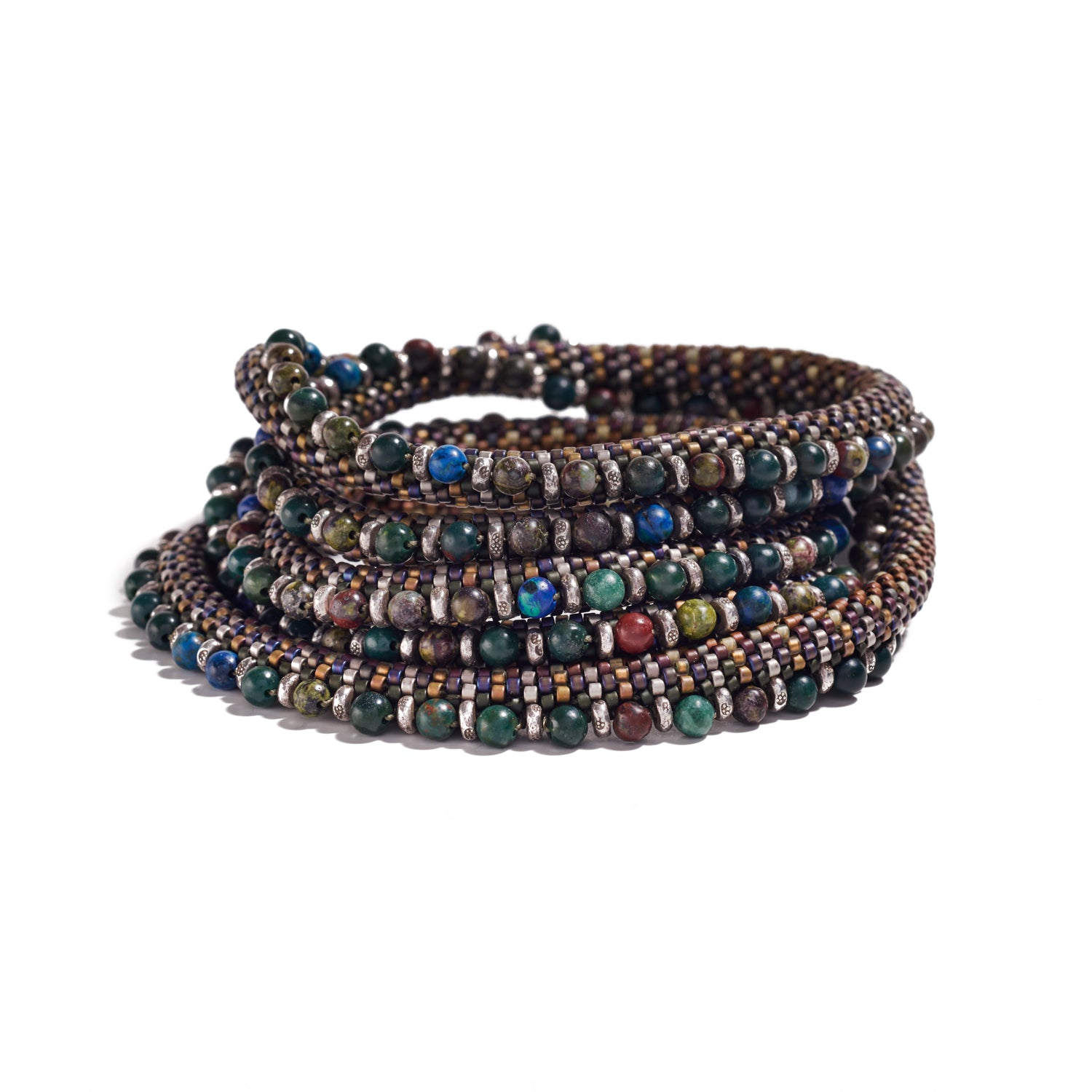 Cylindrical glass beads, round bloodstone, dragon jasper, lapis lazuli, chrysocolla, flat silver