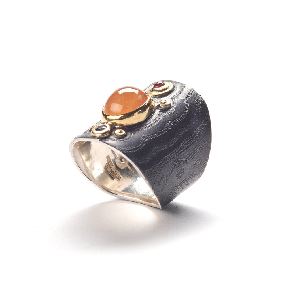 22K yellow gold, oxidized sterling silver, mandarin garnet 6.0cts, red, teal & yellow sapphires, white diamonds
