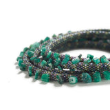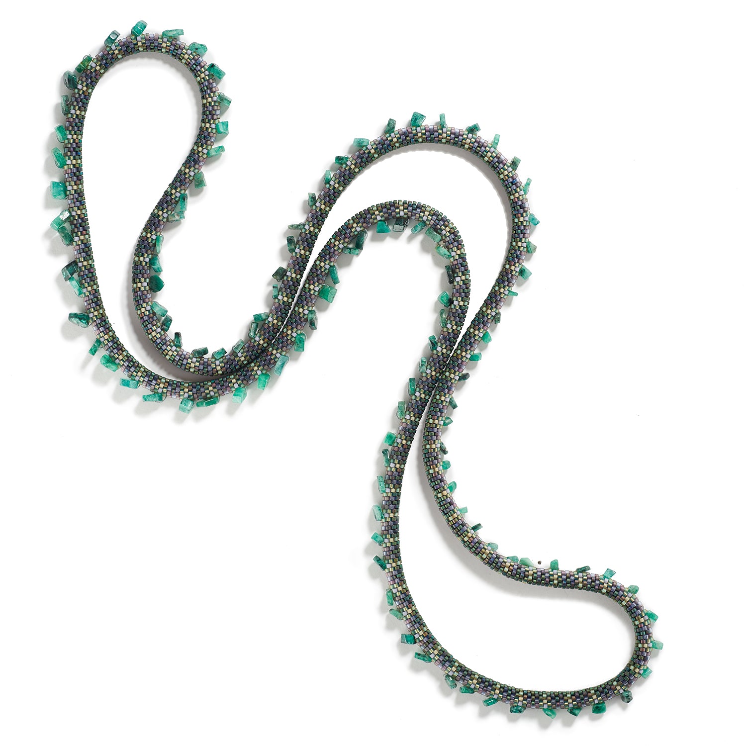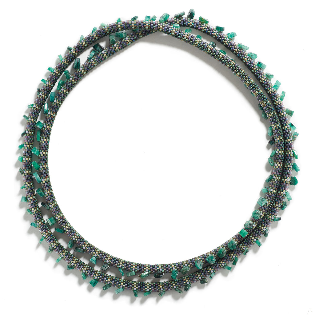 Cylindrical glass beads with line of graduated, shaped emeralds