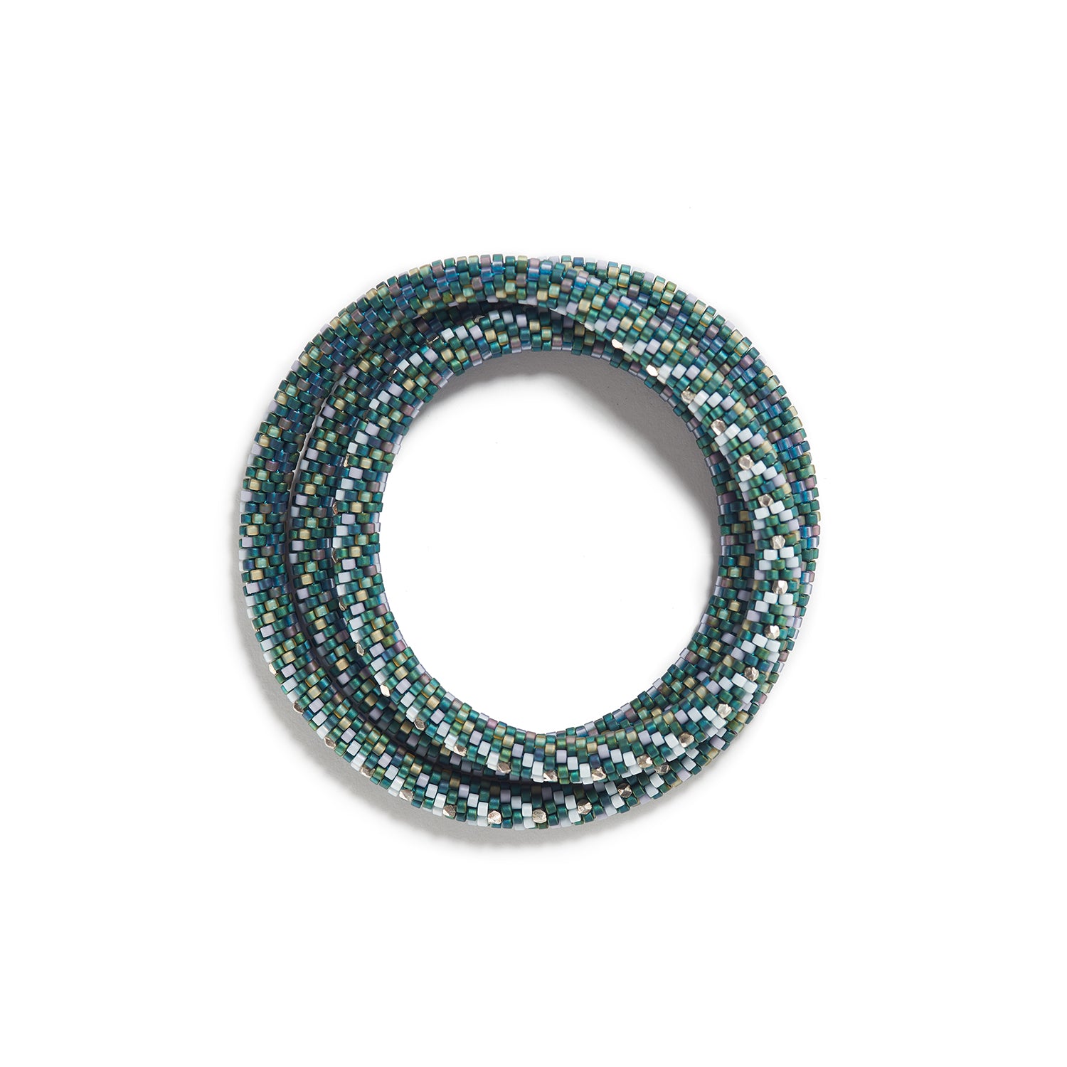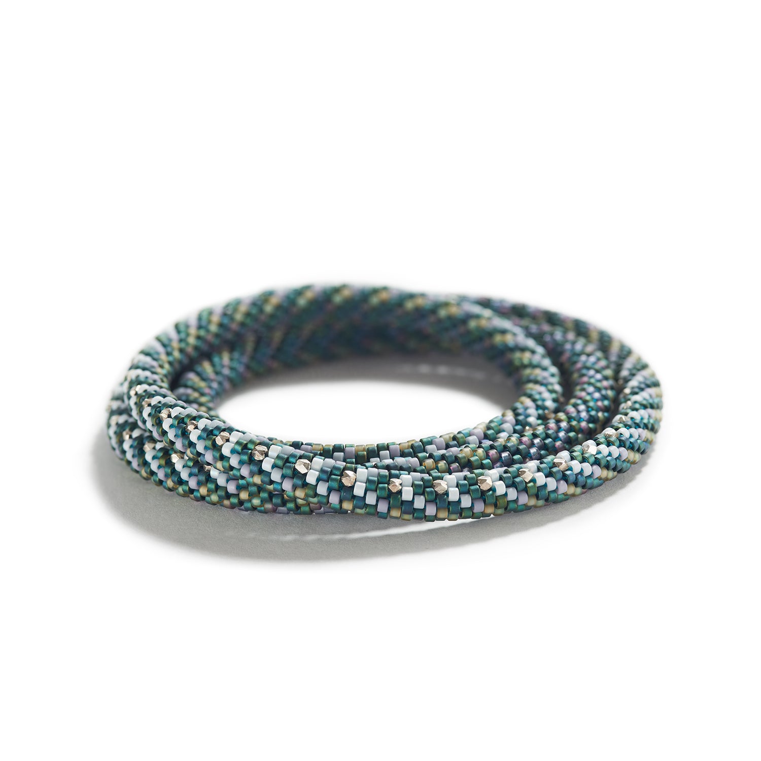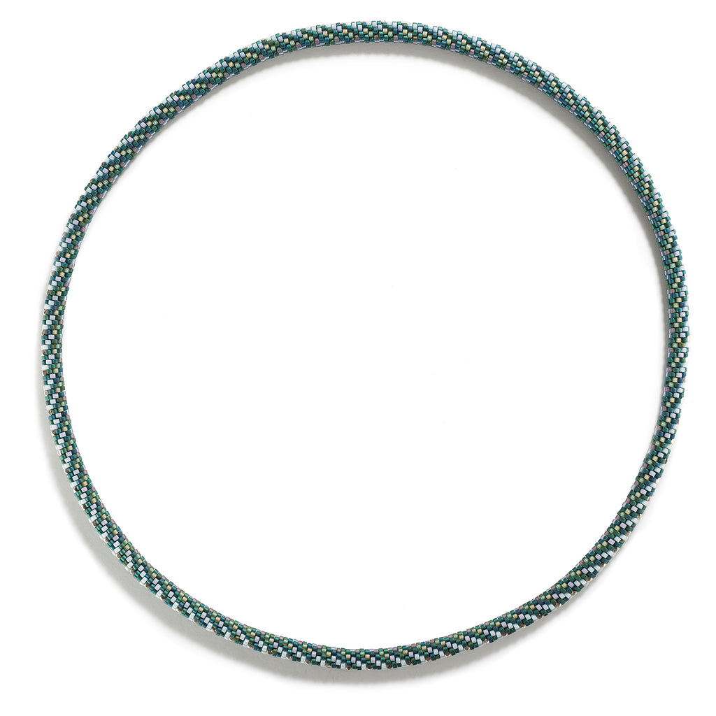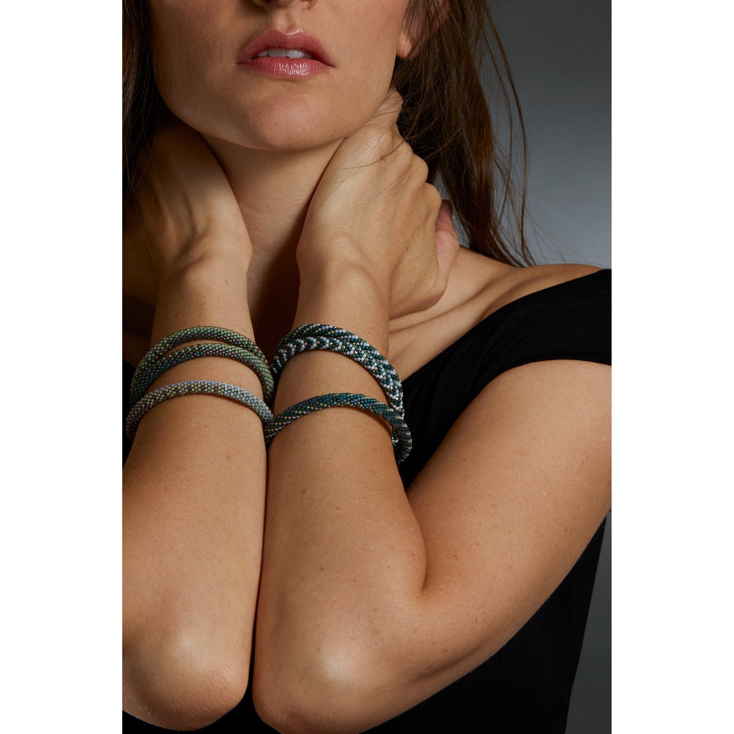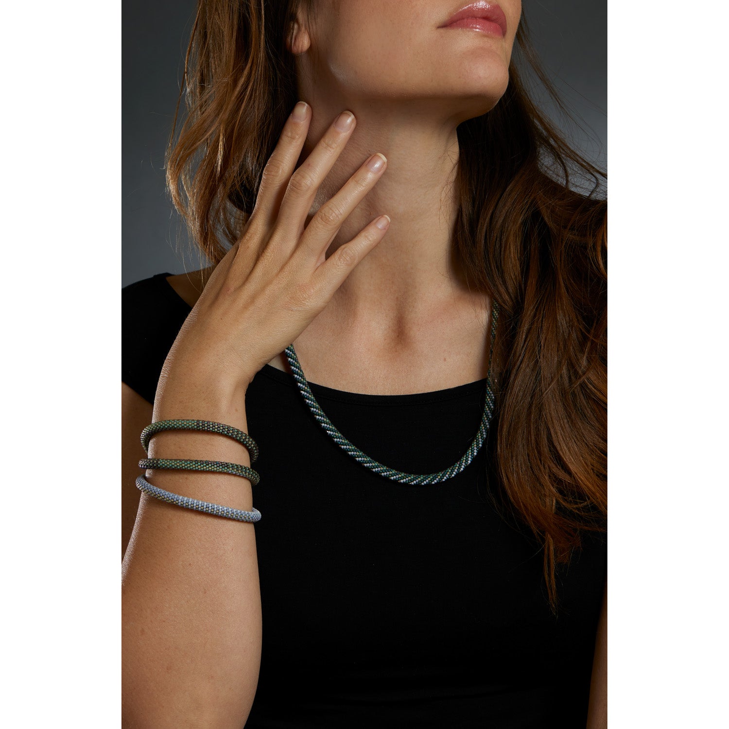 The sweet sirens of spring turn the mind to budding blossoms after April's showers, which gladly takes one into the month of May. Honoring May's rich emerald stone, Claire Kahn creates a compelling array of color, endowed with the gemstone's deep green hue. Within her sumptuous, serpentine composition, metallic purple-blue, brown, bronze and olive green are a striking union, divulging one's gaze upon the jovial interior. Stretching to the exterior reaches of the piece, pale purple and gray pleasingly align to compliment her deep, olive green. A grand touch to the piece, Kahn adds notes of silver nuggets. Quite a lovely accent to sway the eye, as it elucidates its periphery amongst her palpable assemblage. As versatile as it is exquisite, her design may be worn as a necklace, or as a bracelet, wrapped three times around the wrist. Enlivened by nature, awakening after its long wintry slumber, Kahn conceptualizes a composition of superlative measure.