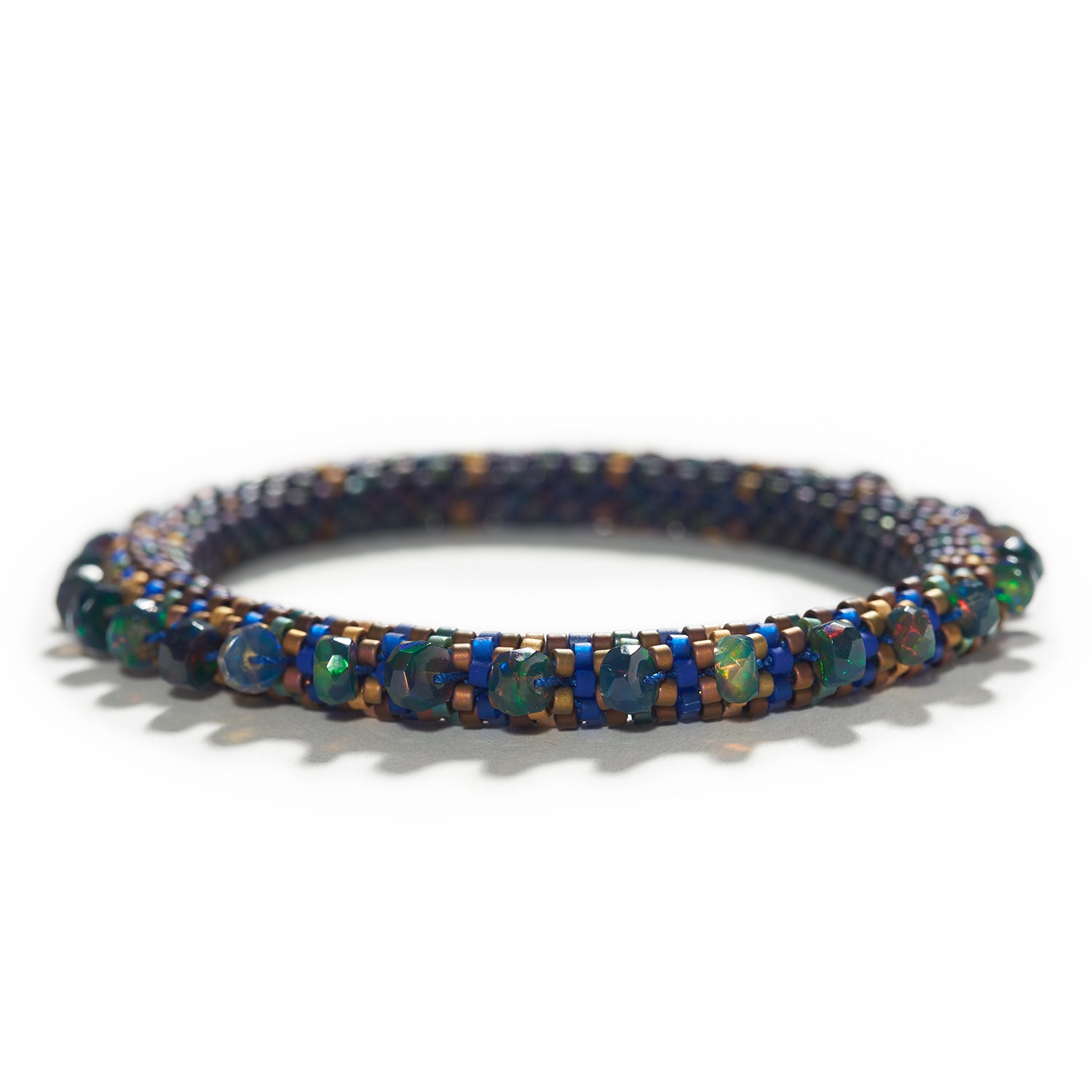 Claire Kahn eloquently scripts glass beads in her 'Lyda' pattern, beautifully lined with a perimeter of faceted opal rondelles. Together, her composition transitions from dark metallic red to metallic green, blue, and gold.