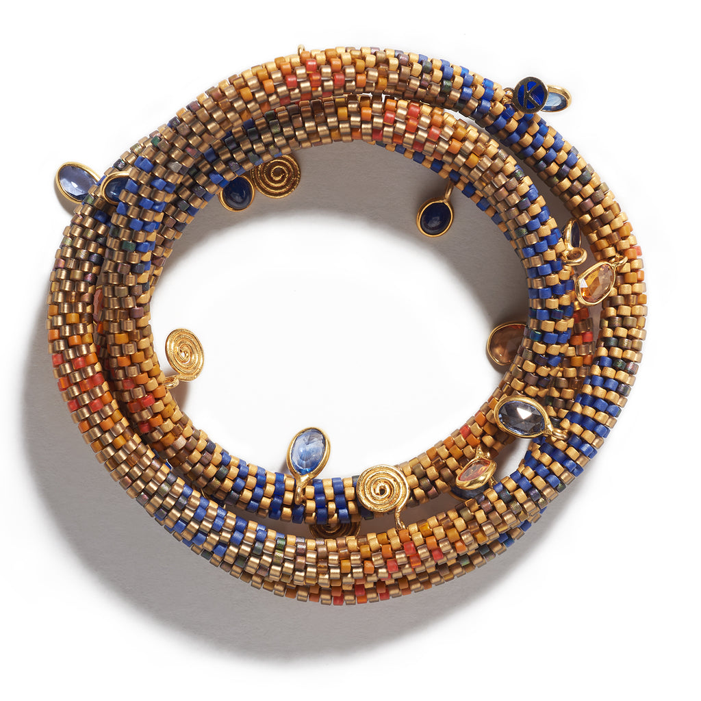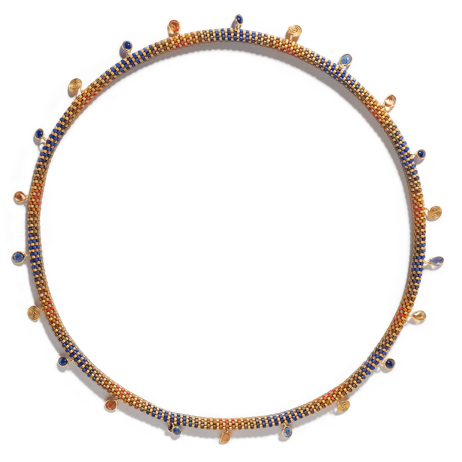 Glass beads are arranged in 'Undulating' pattern that transition from orange, gold, olive and blue. Cabochon blue sapphires coalesce beautifully with faceted blue, yellow and orange sapphires, set in the lovely embrace of 18K yellow gold spiral charms.