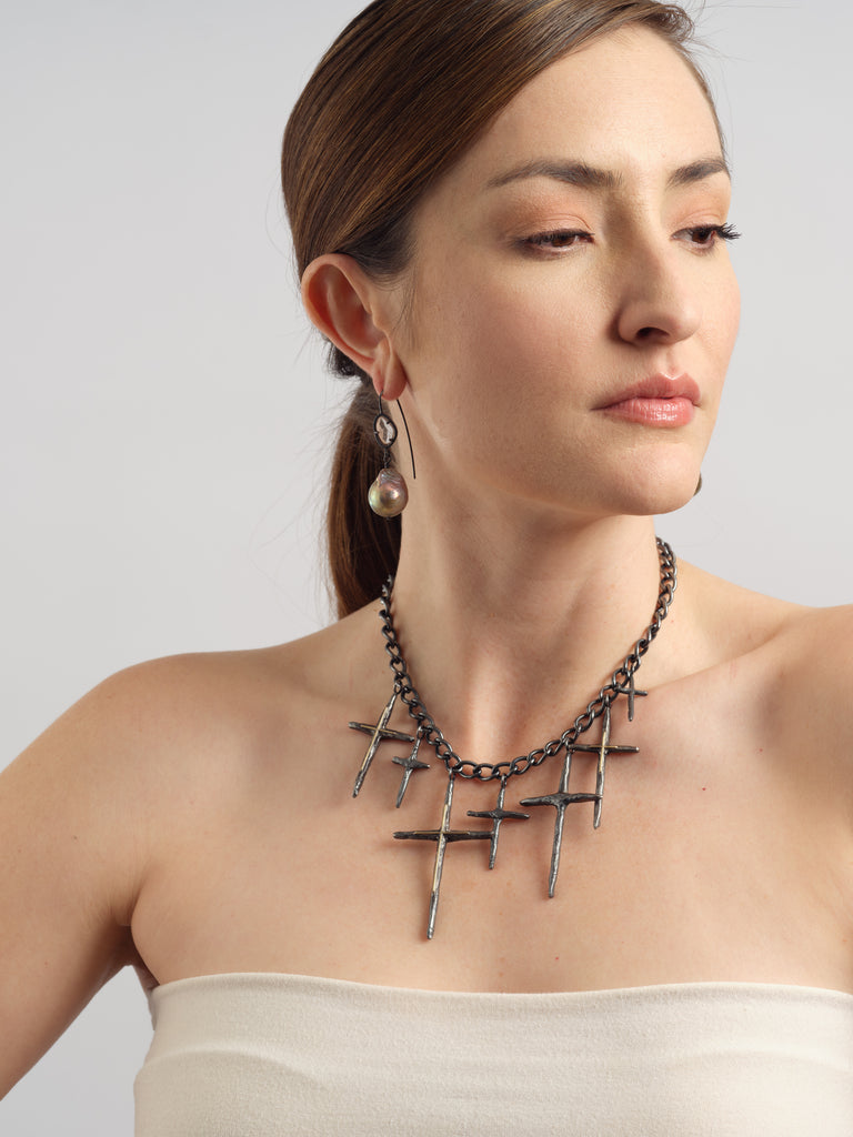 A bold yet refined statement piece, this necklace features seven different-sized crosses suspended from a sterling silver chain. Each cross varies in scale, creating an organic, layered effect that moves fluidly with the wearer. Upon a closer look, one will notice high-karat gold fused on a cross, shadowing the silver while adding warmth and contrast to the cool tones. This unique detailing gives the piece depth and texture, emphasizing the interplay of metals. The necklace is secured with a sterling silver toggle clasp, ensuring both durability and ease of wear. This one of kind necklace merges spiritual symbolism with contemporary craftsmanship, making it a striking and meaningful accessory.
