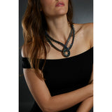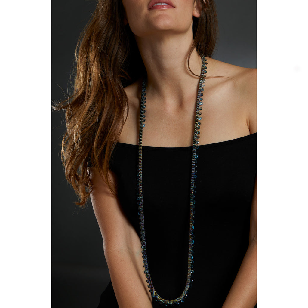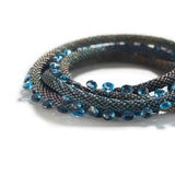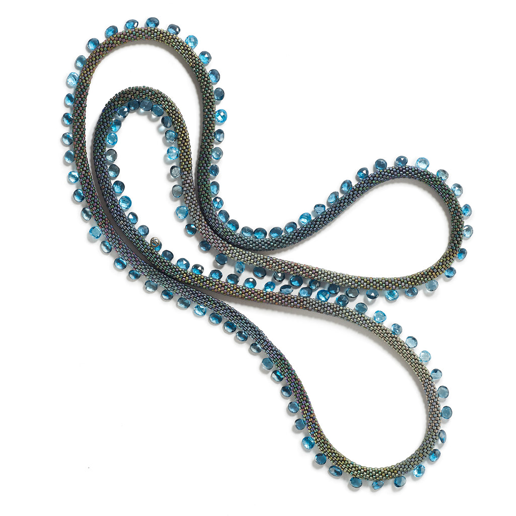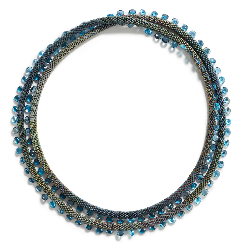 Pleasing, ambient jewels purvey an exquisite, undulating pattern awash with the compelling palette of November, brilliantly imagined by artist, Claire Kahn. Progressing from light to dark, she uses deep metallic blue, blue-gray and olive green to saturate her beaded plane with majestic, rich complexion. Slowly, one's gaze eases upon a softer arrangement of light blue, light metallic green and silver. The ebb and flow of the maker's clever composition resolves to capture our endless fascination. Gleefully positioned around the perimeter of Kahn's piece are vivid notes of Swiss blue topaz, blissfully broken anew with bright, sweet London blue topaz. On the touch of light, these gems incessantly sparkle, dazzling the soul with their sheer glister and shine. To enrapture the heart, Kahn marvels one once again with her exceptional discernment of design to honor the lovely month of November, before slipping into the dreamy delight of wintertide to come.