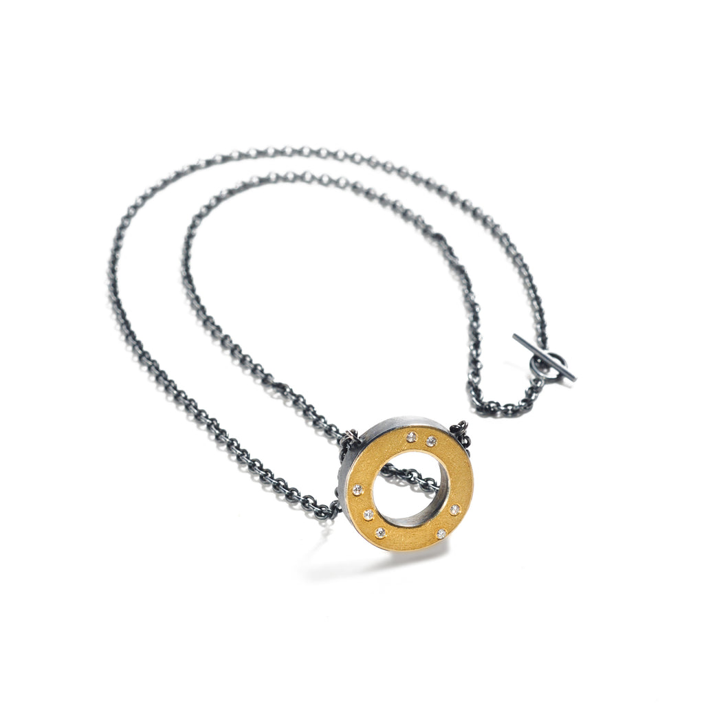 24K yellow gold, oxidized sterling silver, 7 bezel-set faceted diamonds 0.07 total carat weight