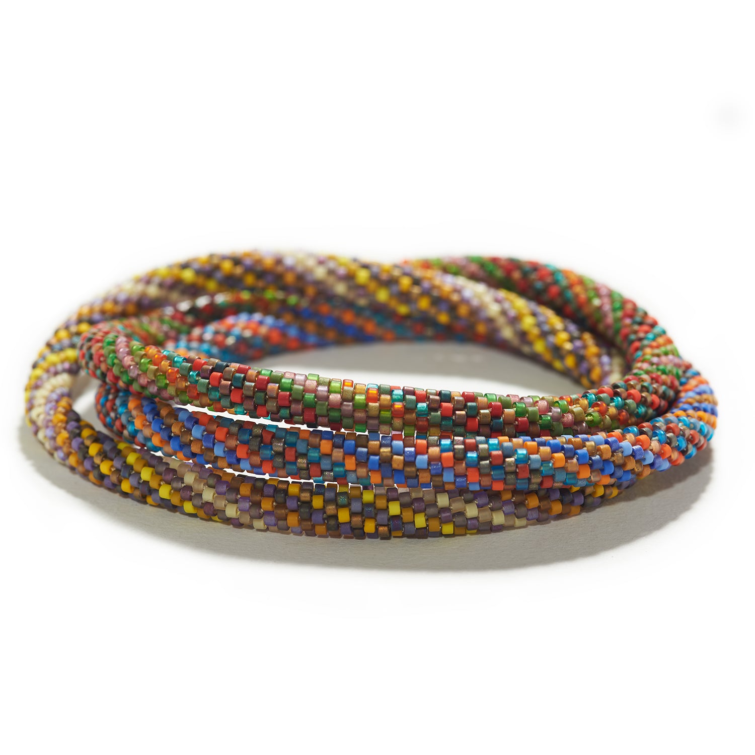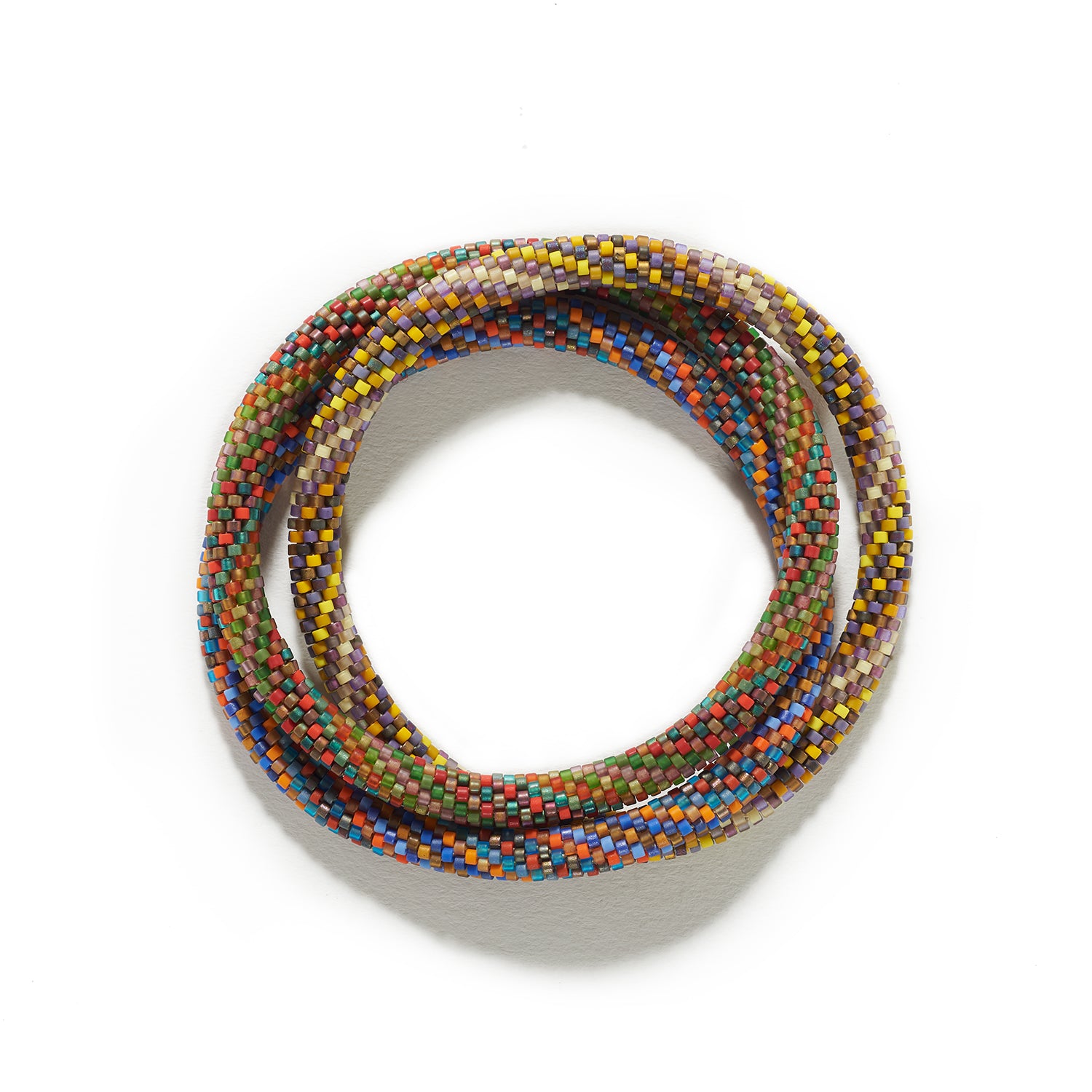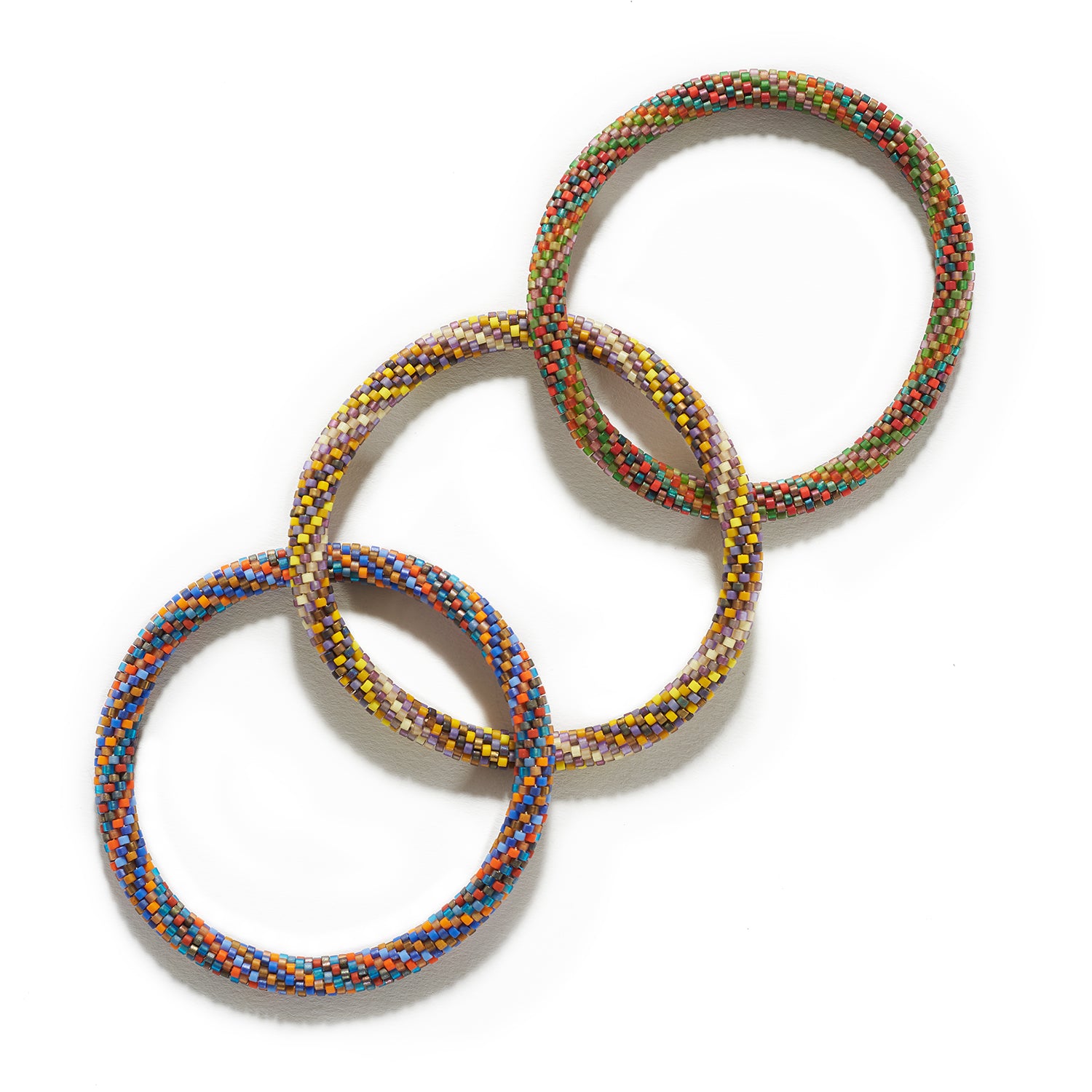 Spiral pattern in three rings. First ring in purple and yellow. Second ring in blue and orange. Third ring in green and red.