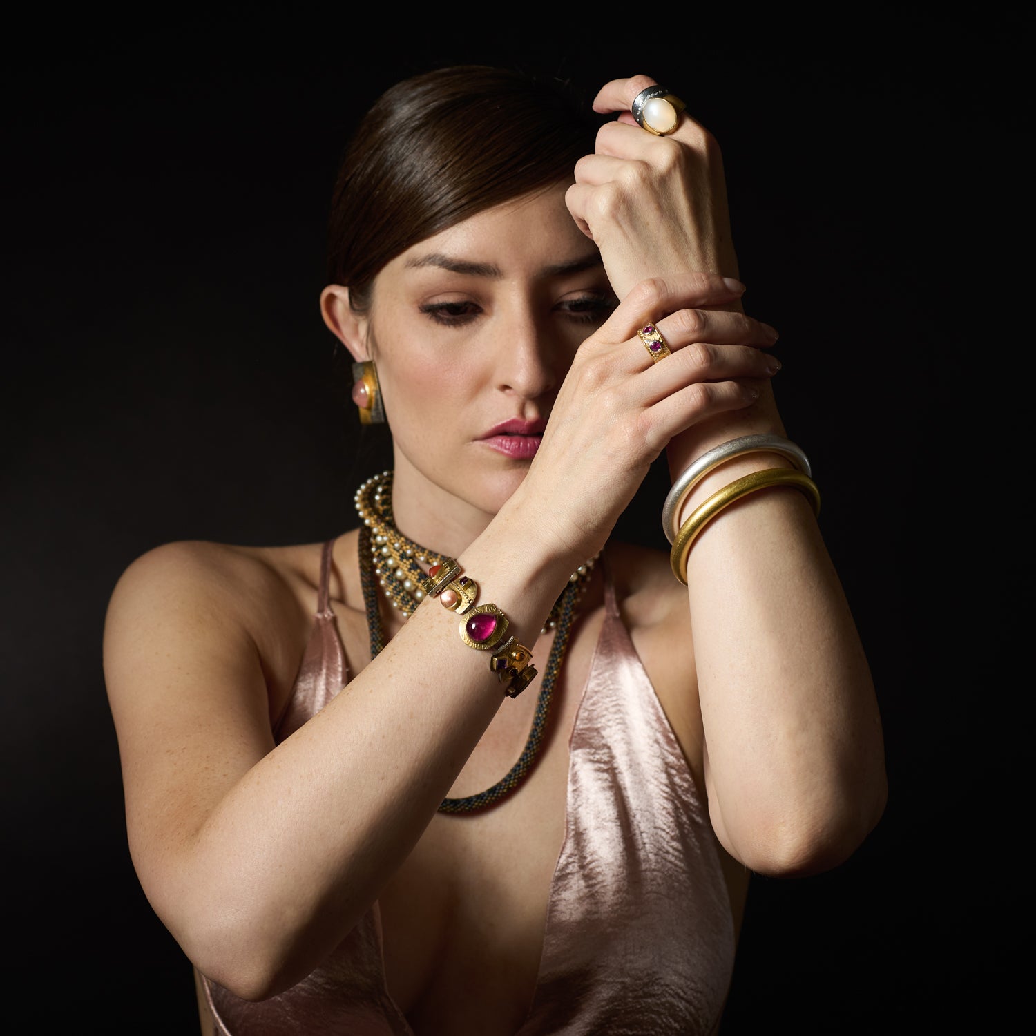 As shown with: Sterling Silver Eternal Bracelet~8mm, Gold Eternal Bracelet ~ 8mm, Moonstone Ring with Diamonds, Platinum & Gold Band with Ruby, Rose Quartz Earrings with Clips, and Mughal Pattern Pearl Necklace.