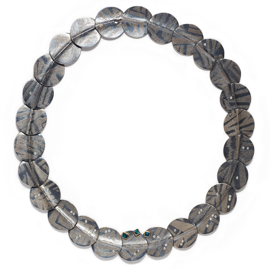 Peter Schmid of Atelier Zobel creates a brilliant, repeating circle motif made of platinum and silver. Its sleek forms are dappled with the blended elegance of princess cut and tiny, surface-set diamonds. The heart experiences a splendid fixation as the piece is placed on the body. The attractive continuity of these round discs is a mesmerizing expression to behold. Elements are gracefully overlapped to rest peacefully when worn. Expert craft and precision are present while seamlessly hidden behind the design. Schmid presents a wonderful addition to your soul-stirring collection.