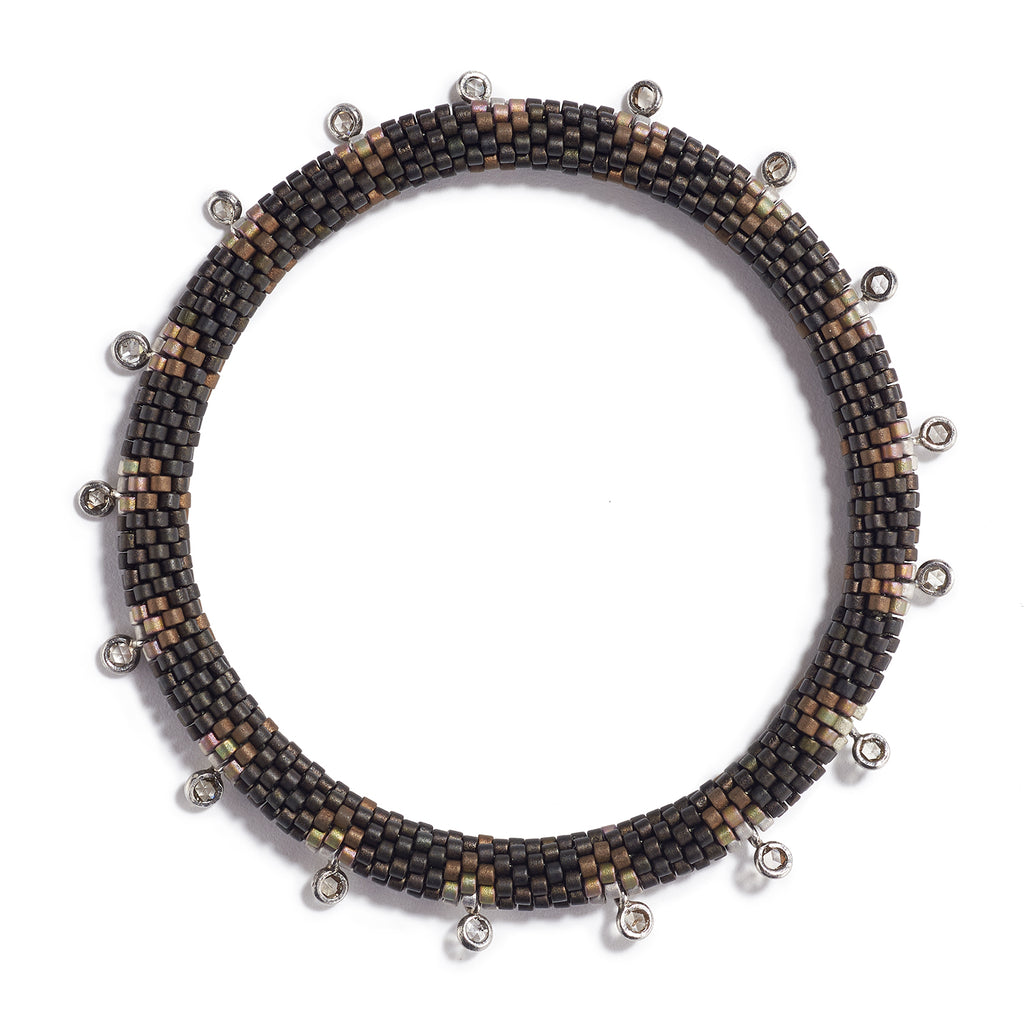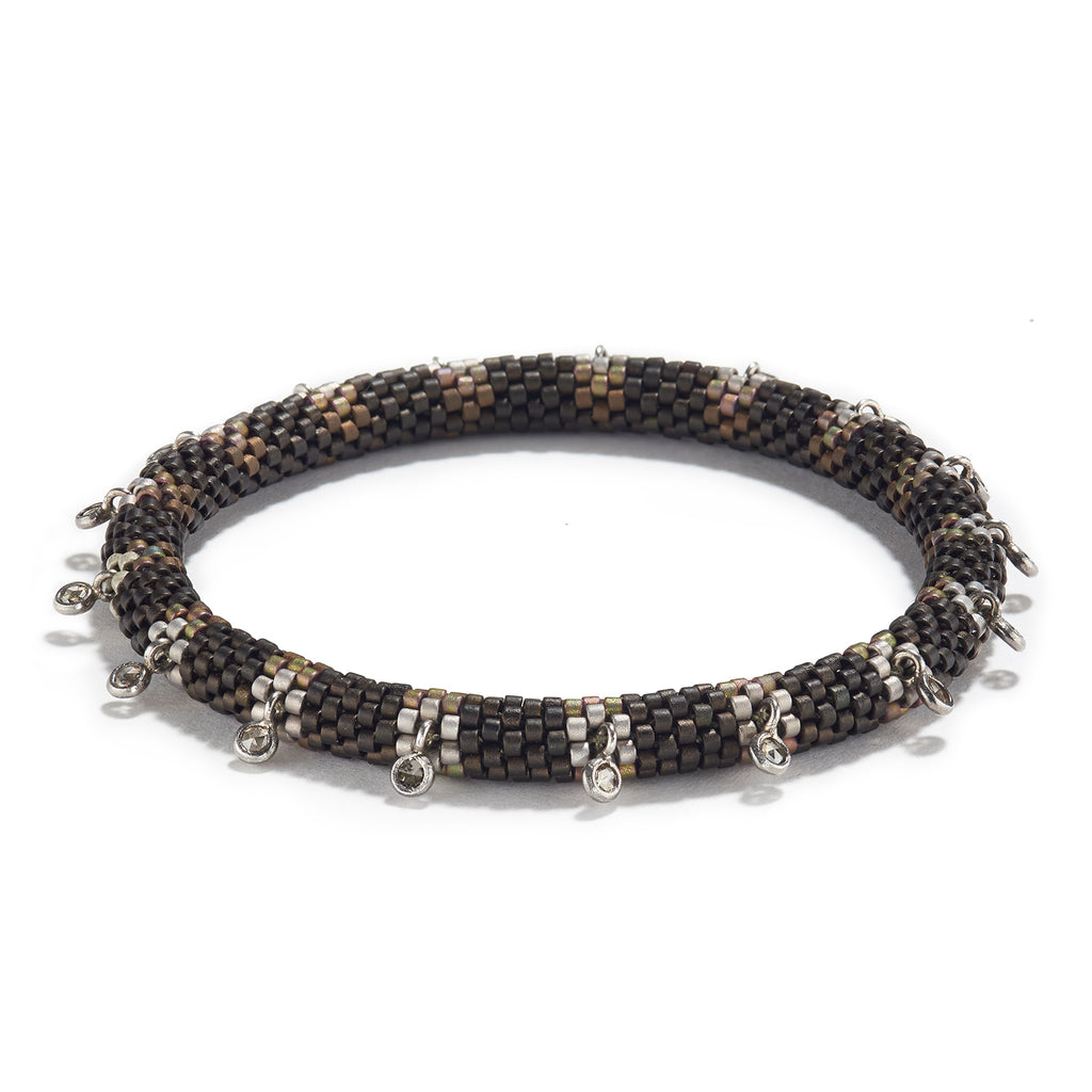This 'Pools of Light' patterned bracelet is accented with a line of white diamond beads bezel set in tarnished silver.