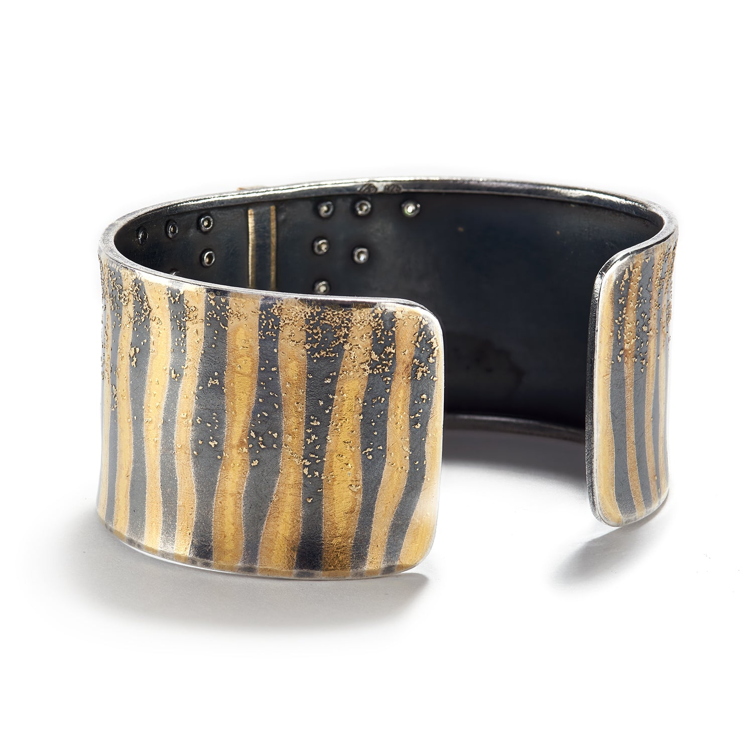 Oxidized sterling silver, 24K & 22K yellow gold, 0.73cts raw diamonds., 0.14ctw champagne colored diamonds, vsi