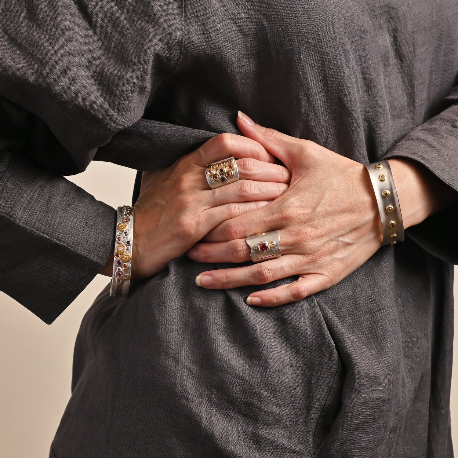 As shown with: Round and Oval Gold Link Necklace, Jedi Red Spinel Earrings, Rich Golden Diamond Bracelet, Ruby and Sapphire Honey Comb Ring, and Ruby, Sapphire, and Diamond Bracelet.