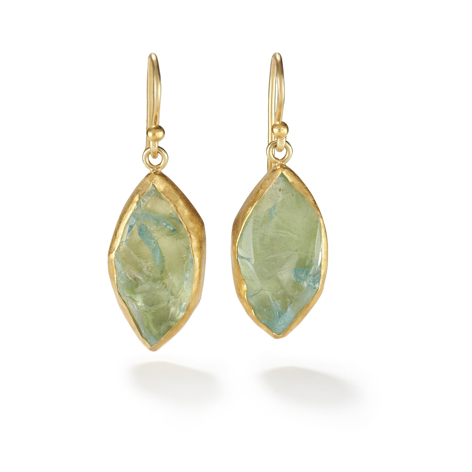 Cool pools of light shimmer in pure effervescence in this extraordinary piece by Petra Class. The roughly shapen aquamarines exude irresistible intrigue as the eye follows the slight projections in correspondence to the shallow depths upon its surface. The unique peculiarities of the stones are elegantly poised between crafted bezel sets of high karat gold. Luscious golden gleam glamorously balances with the soft tones of the aqua to emit a taste of sheer admiration when worn. Upon the ear, the work is delicately balanced, and at a glance a marvel to behold. Remaining true to every turn of the head, and ever more radiant with each touch of the light. Petra's work is sure to arouse wonder, with beauty to continuously tempt your desire.