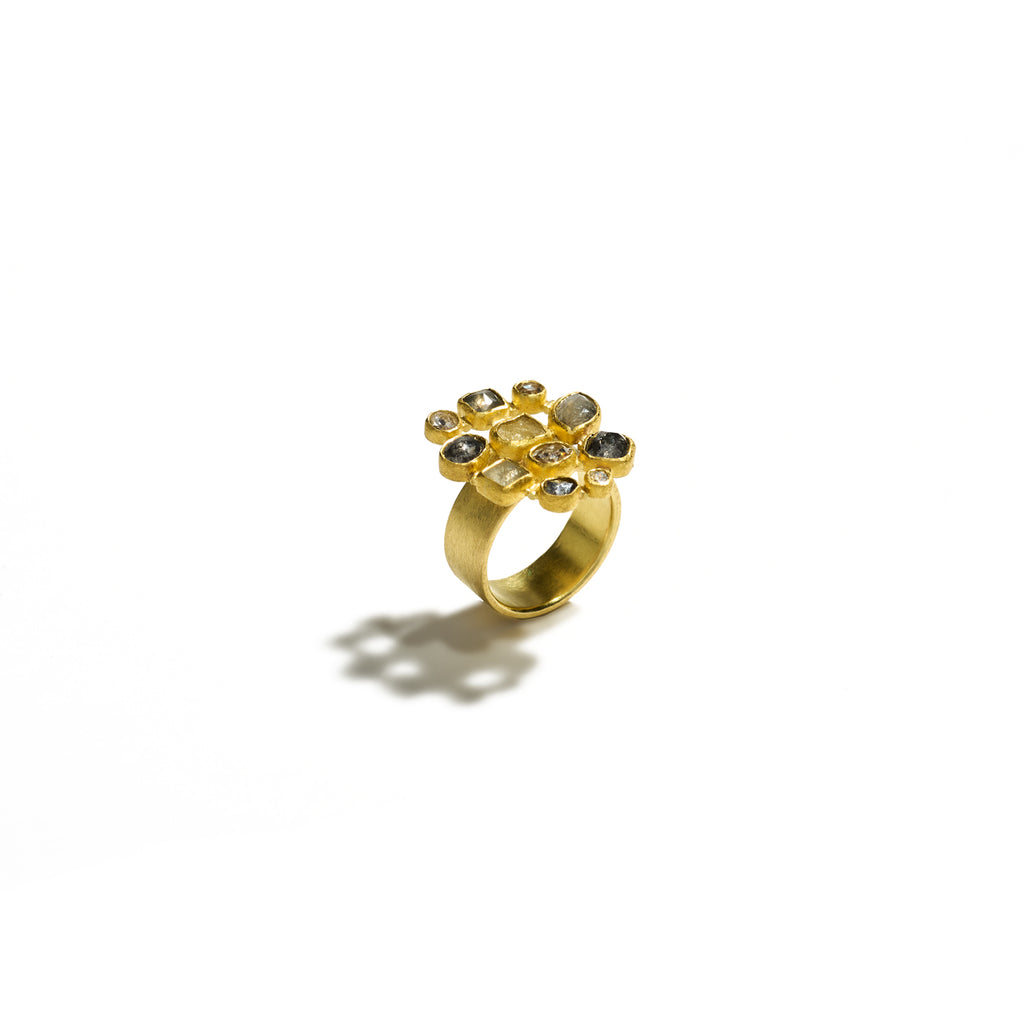 A parallel to music, Petra Class's mosaic diamond ring is a stunning testament to rhythmic artistry and craftsmanship. Crafted in high karat gold, a mosaic of raw sparkling diamonds are arranged in an organic composition radiating a warm tone that enhances its luxurious appeal. The interplay of the natural textures and the brilliance of the gold creates a dynamic visual contrast, emphasizing elegance, offering a piece that is as unique as it is timelessly sophisticated.