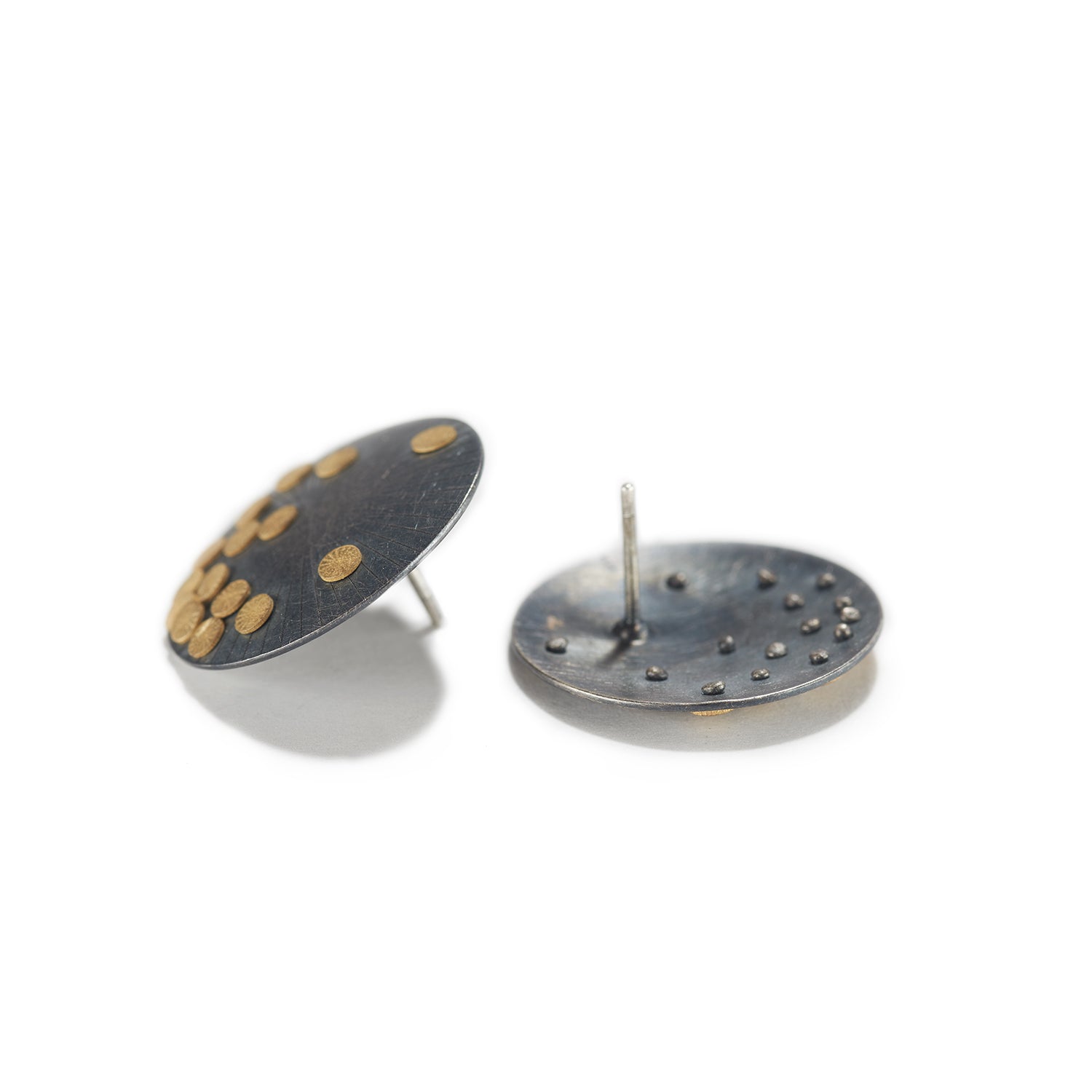 A round concave of silver is adorned with small gold "samurai discs" layered and spread apart on the surface to affirm the exotic confection. Riveted to the back of the form, almost like braille, a hidden language of alluring love.