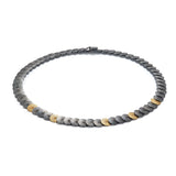 So is this collection that small flakes form surfaces like breastplates of medieval warriors, coats of oxidized battles or just the shell of a mythological animal. The colors come from metal finishing, semi oxidation matte gray and gold, are sober, austere and give the pieces an elegant air.