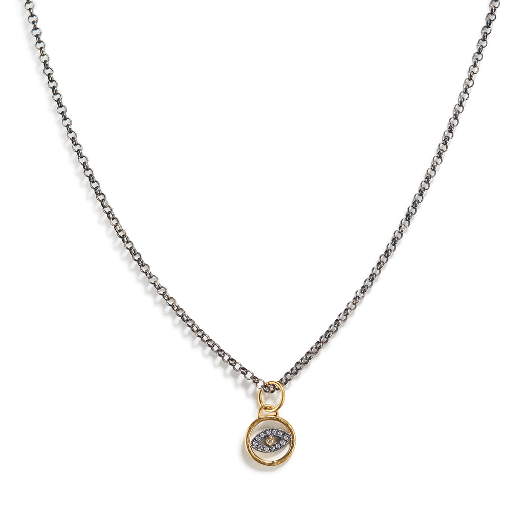Enraptured with an unmistakable glow and a reverent meaning, the eyes have been protecting those in Anatolia for centuries. Meant to protect, shelter and to comfort, the eyes cast away sour meaning and intention. Eloquently represented in a beautiful form of silver, the lining of the shape is nicely complimented with an array of diamonds. A lustrous stream of high karat gold finishes the piece, leaving room for abundant adoration in its wake.