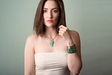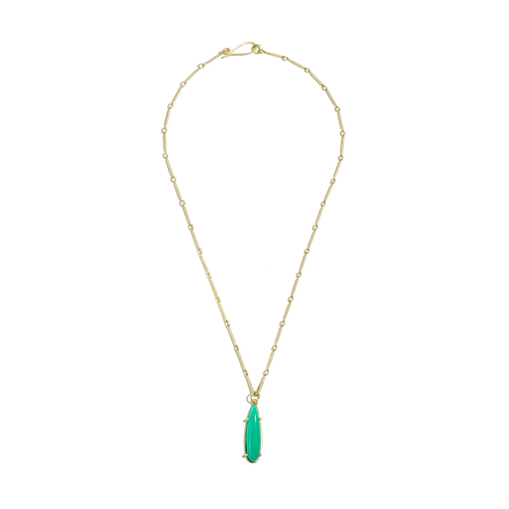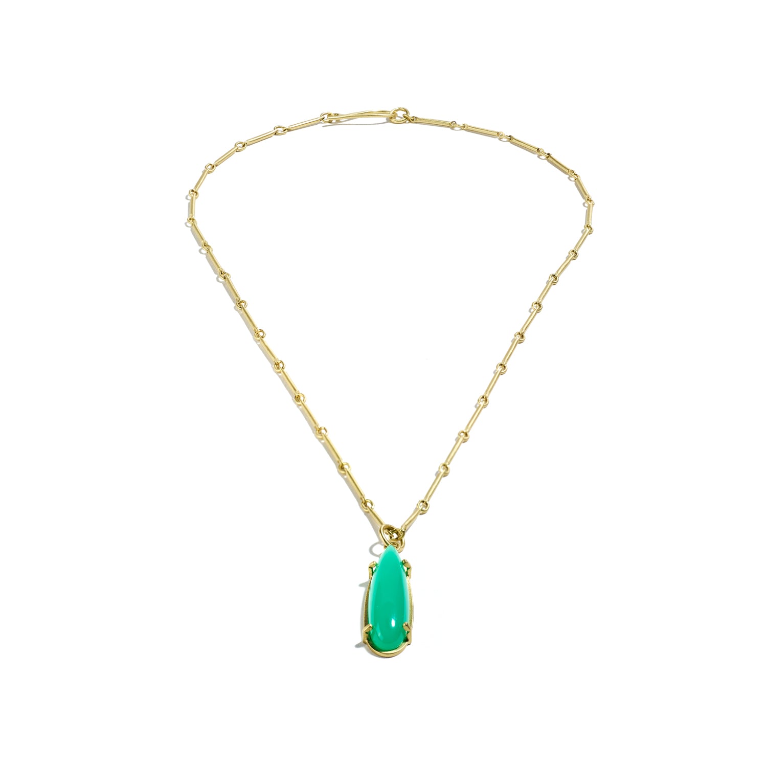 As shown with: 17" Gold Bar and Loop Chain, 19" Gold Bar and Loop Chain. Chrysoprase Cuff, Gem Silica Pendant, and Large Chrysoprase Pendant.