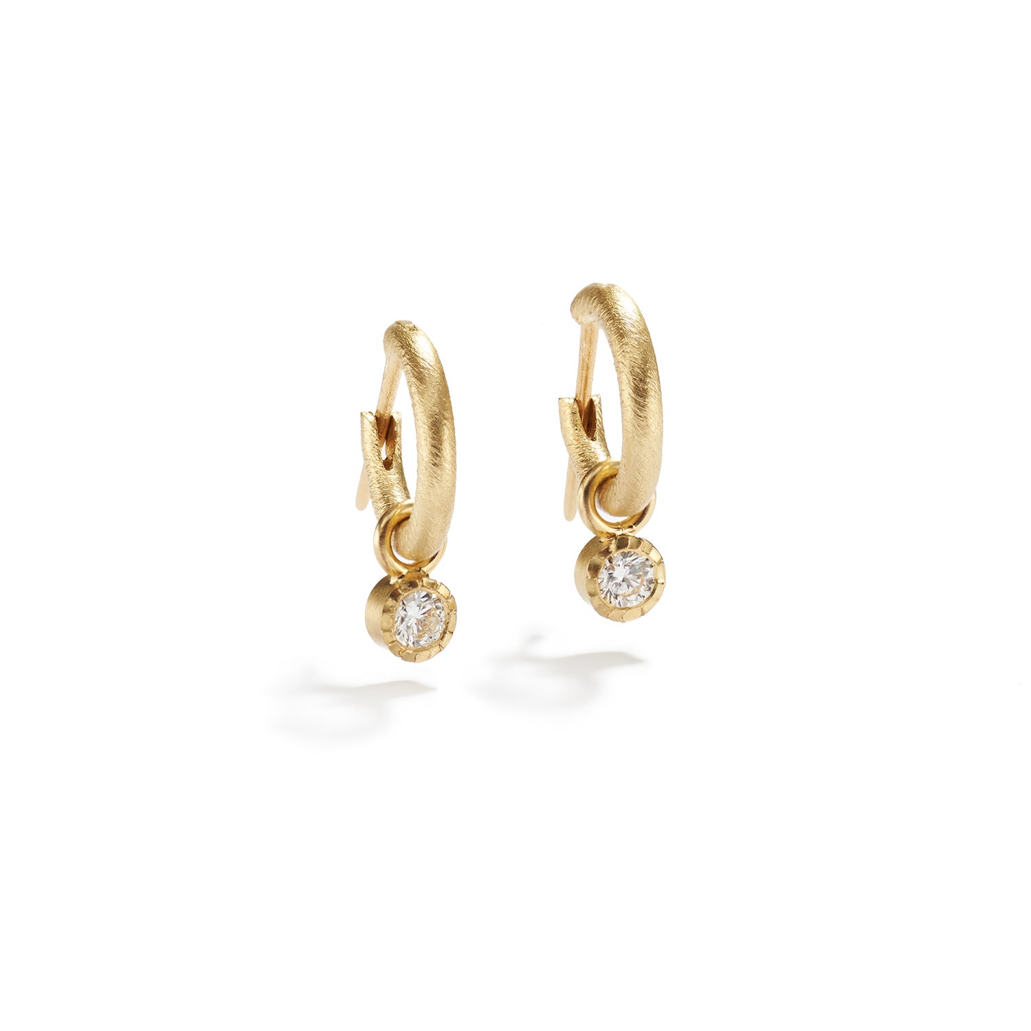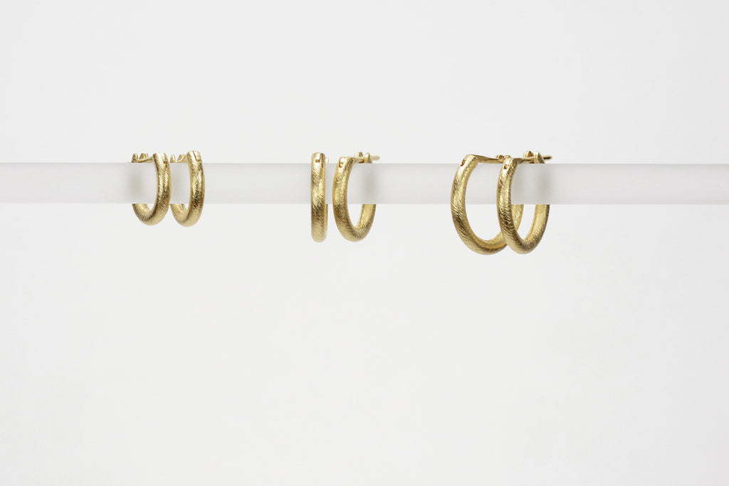 Exquisite pair of petite earrings in high karat gold, the Small Classic Gold Hoops by Cheryl Rydmark are easy to wear, delicately hug the ear and allow for all sorts of expression. As the main event, embellish the hoops with drop charms, also made by Rydmark, to your collection. The small nature of these hoops may also be worn in accompaniment to other earrings on the ear. Hoops are available in small, medium and large.