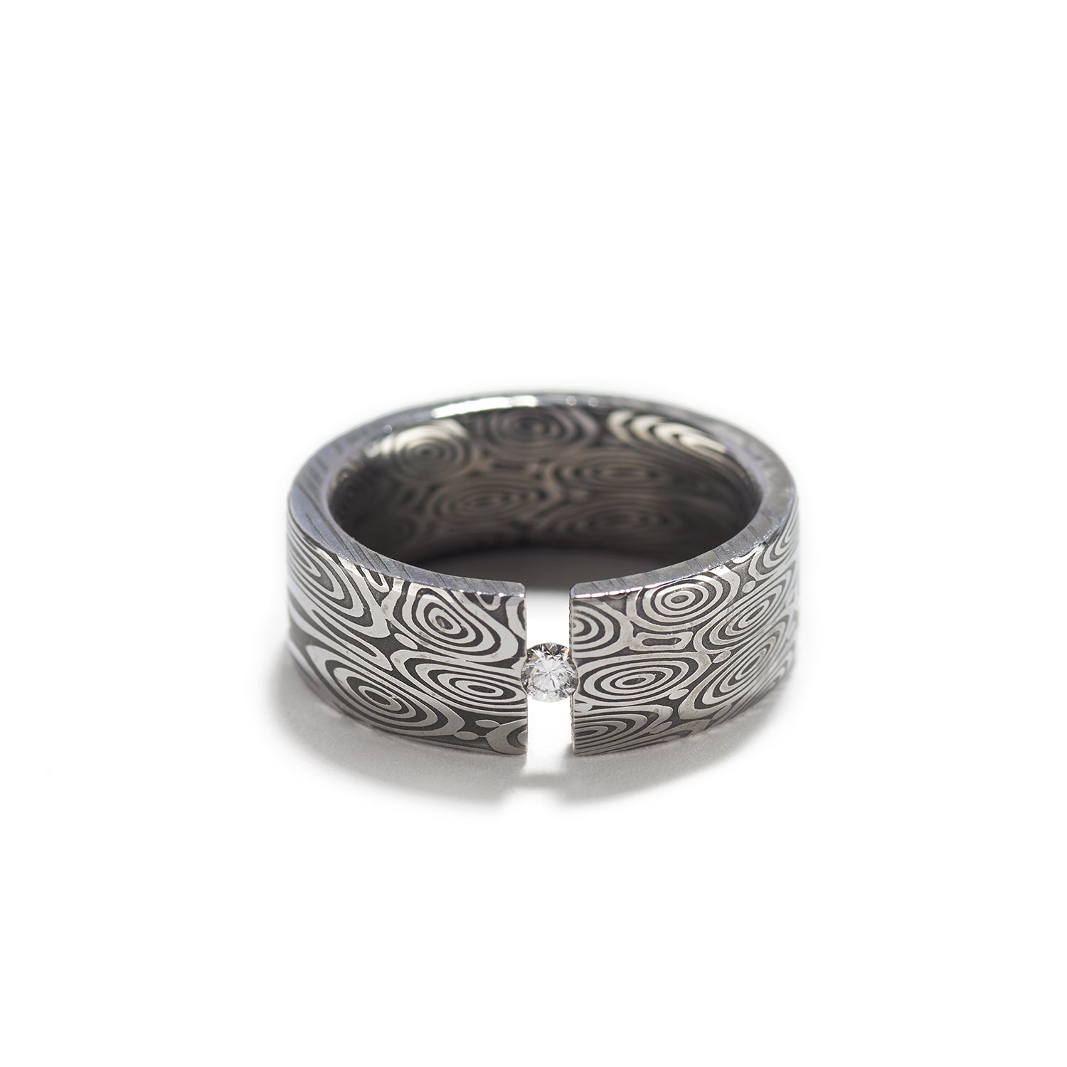 The classic low dome band by Phil Poirier is much to admire and a comfortable fit on the hand. His Starry Night pattern beams with movement. Dignified, yet subtle selection of concentric shapes navigate the ebb and flow between their circular and elongated selves against a smooth slate sky. Upon its union, the band gathers together to carefully hold a extraordinary diamond in a tension set. Alas, this piece is the elegant versatility you've been looking for.
