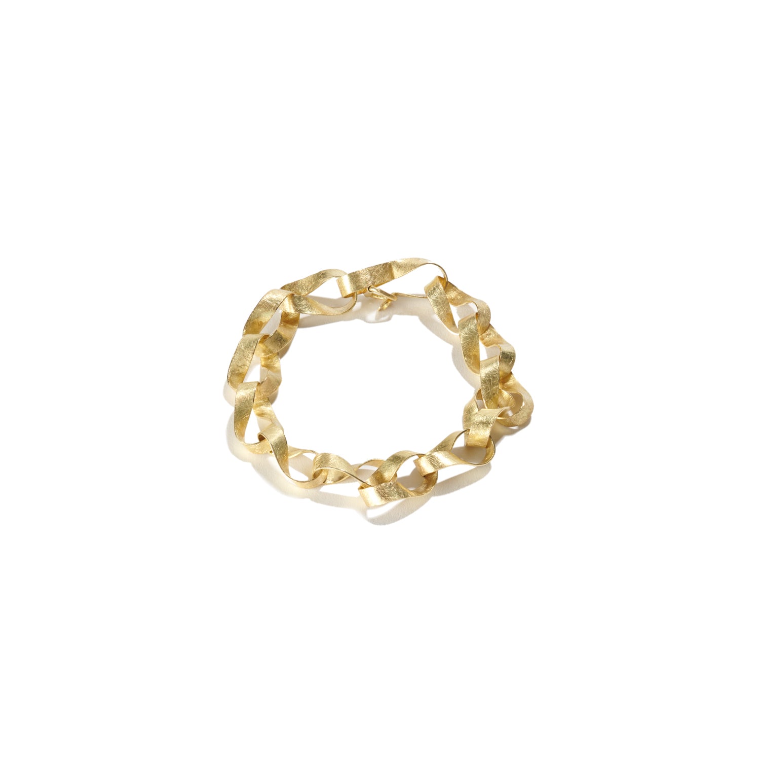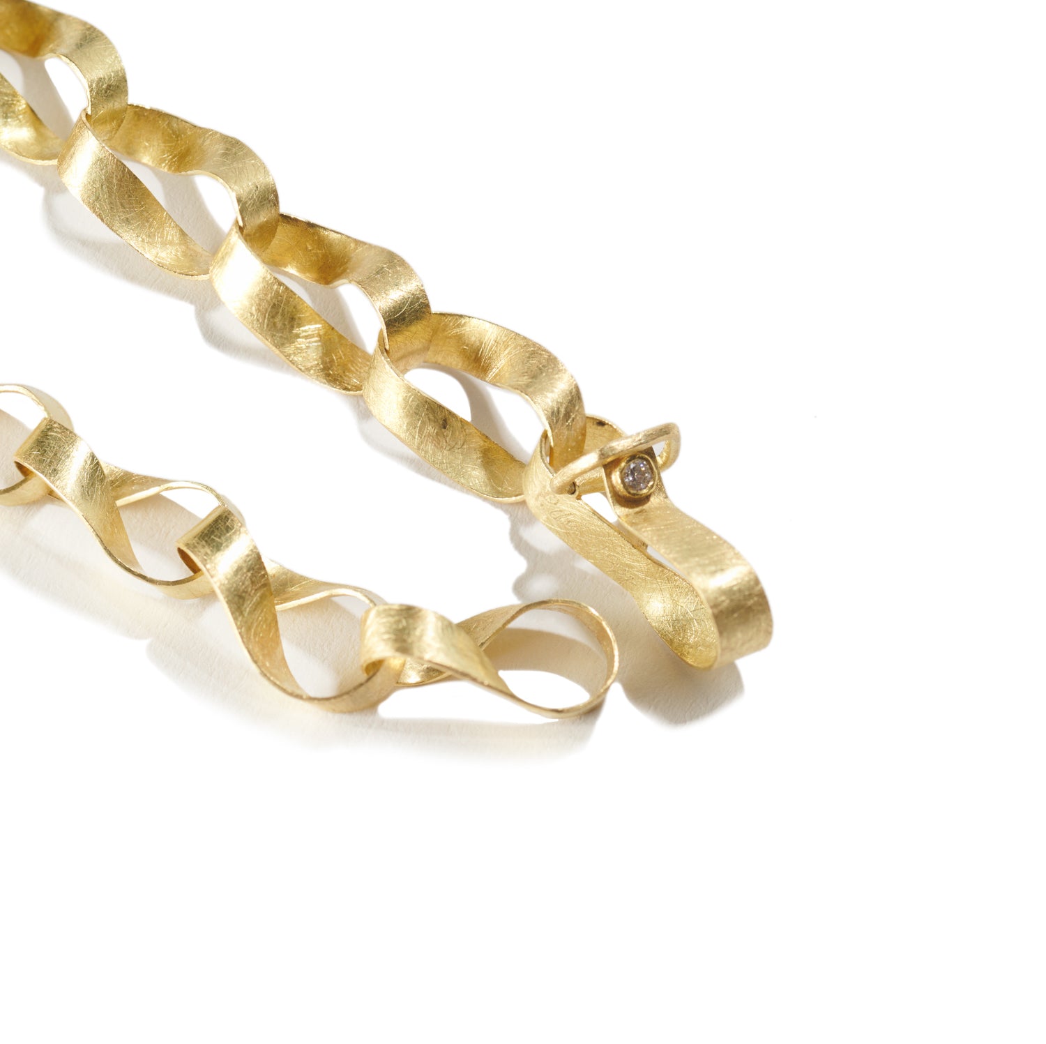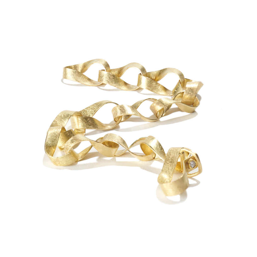 This smashing Mobius link bracelet resembles multiple ribbons of gold intertwined. It wraps the around wrist with elegance and civility. A single white diamond accents the hook and eye clasp.