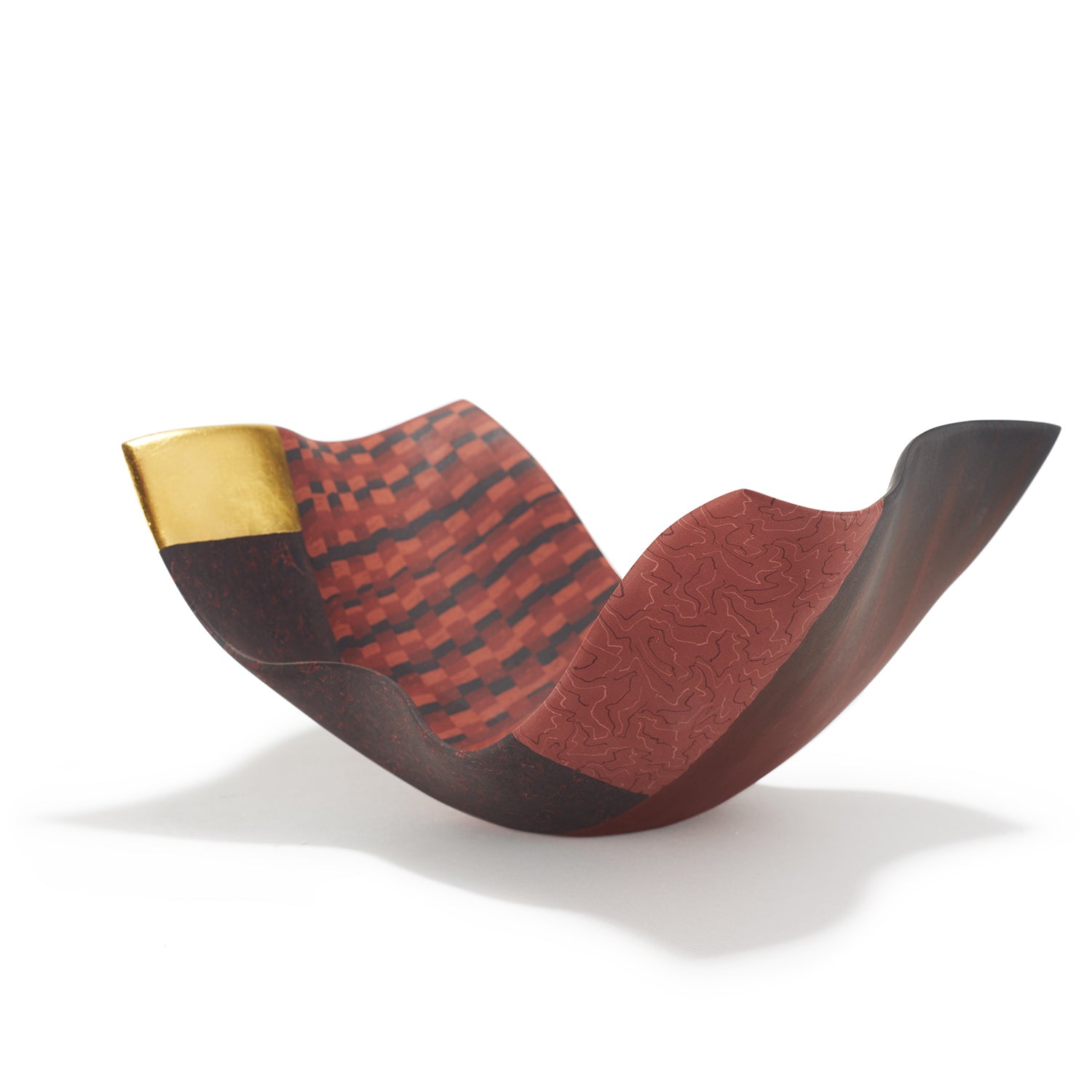Working in the Japanese technique of Nerikomi, Thomas Hoadley fulfills his artistic vision throughout this exquisite porcelain structure. Monochromatic color and pattern comprise this arabesque vessel. Shapely figures are set waves of red and black and are brilliantly married in the form. With a dash of gold leaf, the contrast shines through upon its surface creating a dynamic relationship of movement and ease in this exceptional work of art.