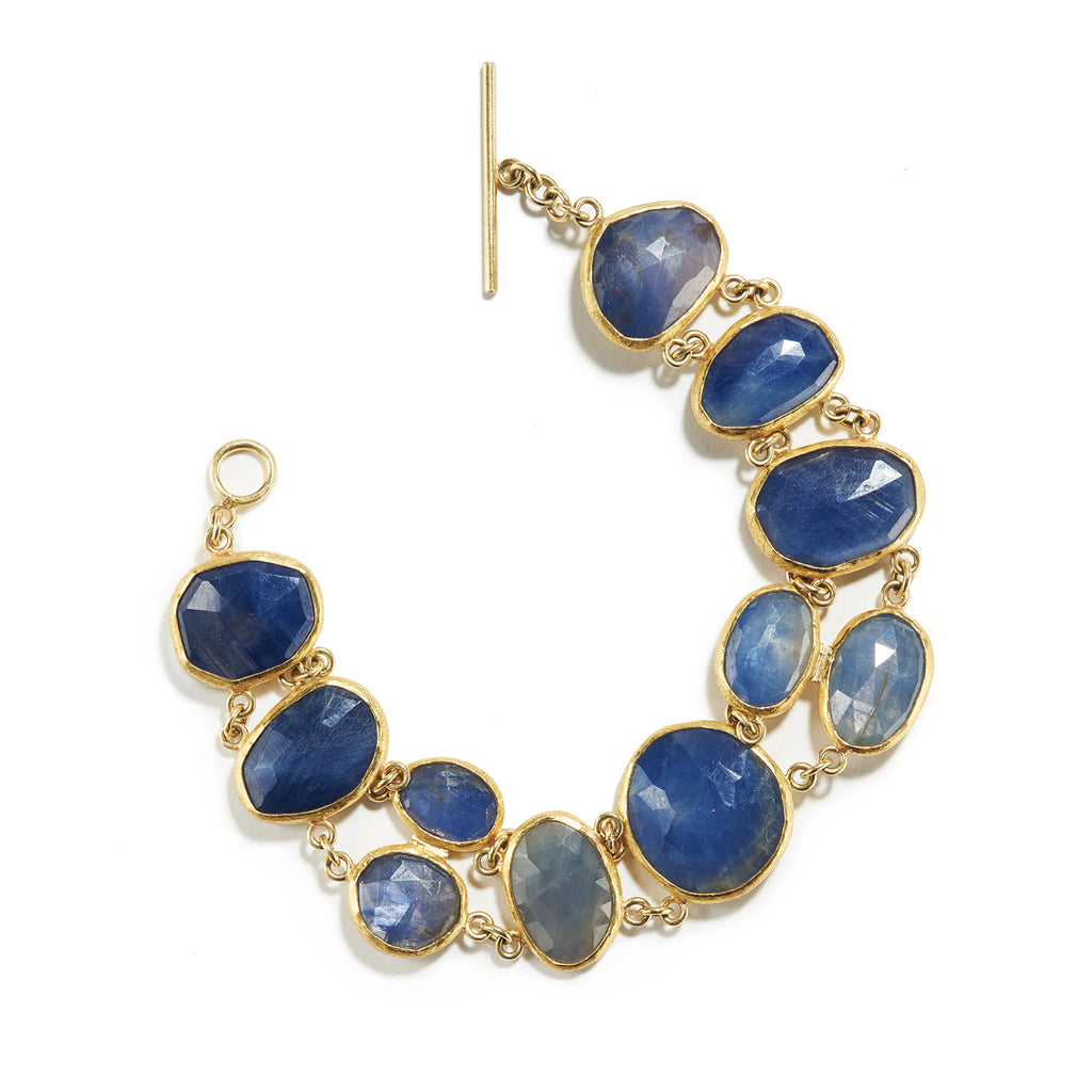 A medley of deep blue, rose cut sapphires join a beautiful assemblage in varying shapes and hues. Tracing the gaze over the entirety of the piece, one may marvel at how these exquisite gems sparkle harmoniously in this delicate, yet dynamic bracelet. All the while, admire the sheer craftsmanship of the work. Its masterful maker wields her intended design skillfully in high karat gold. Petra Class creates a distinctive design that remains a wonder on the body as well as an expression to ever satisfy the soul.