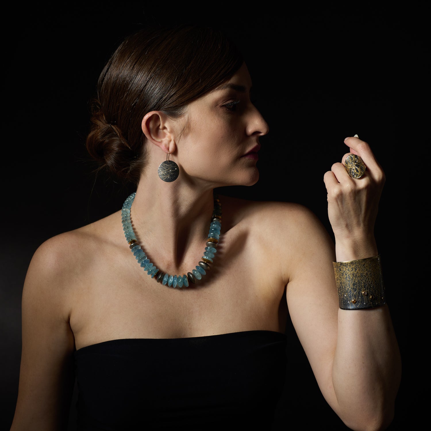 As shown with: Aquamarine Disk Necklace, Fireflies Bracelet with Sapphires, and Undulating Silver & Gold Disk Earrings with Platinum.
