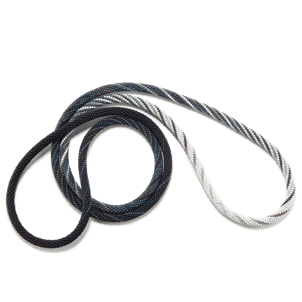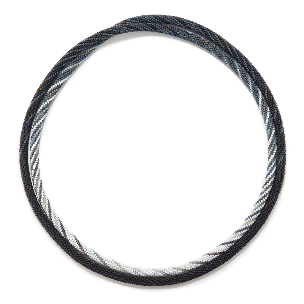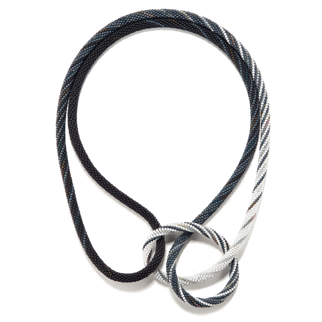 "On December 3, 2017, I saw a Super Moon. My view was from an overlook in the Jemez Mountains across the valley towards the east, where it rose over the Sangre de Cristo mountains. The most dramatic moment was driving down into the valley. The night sky was jet black and the moon was bright white as I ever saw it. It was this view, the contrast between black and white, that inspired this necklace."