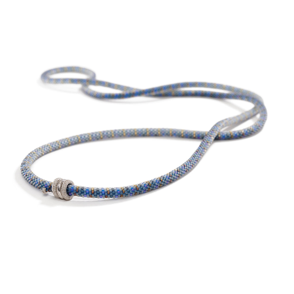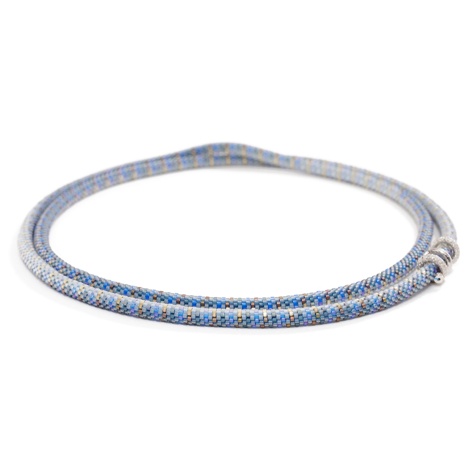 Lyda pattern in whites, grays, blue-gray and medium blue, with 2 diamond Pavé rings, 1 white gold ring and 1 Pavé diamond stopper bead.