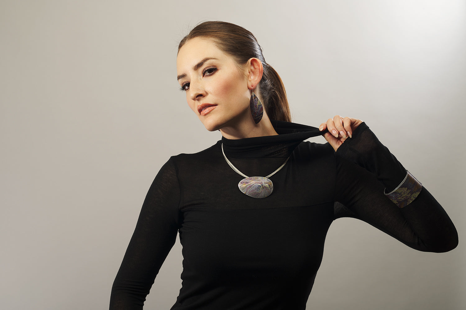 In a dynamic and inventive process, Jane Adam creates works of adornment from anodized aluminum. Works of art arise out of this light and malleable metal as she conversely, creates a solid and durable expression to last forever. Texture emerges through a tapestry of color as the metal is crazed, and as hue softens and patinas. Adam's earrings exude vibrancy and eloquence upon the body, and a lasting fixture of perpetual admiration.