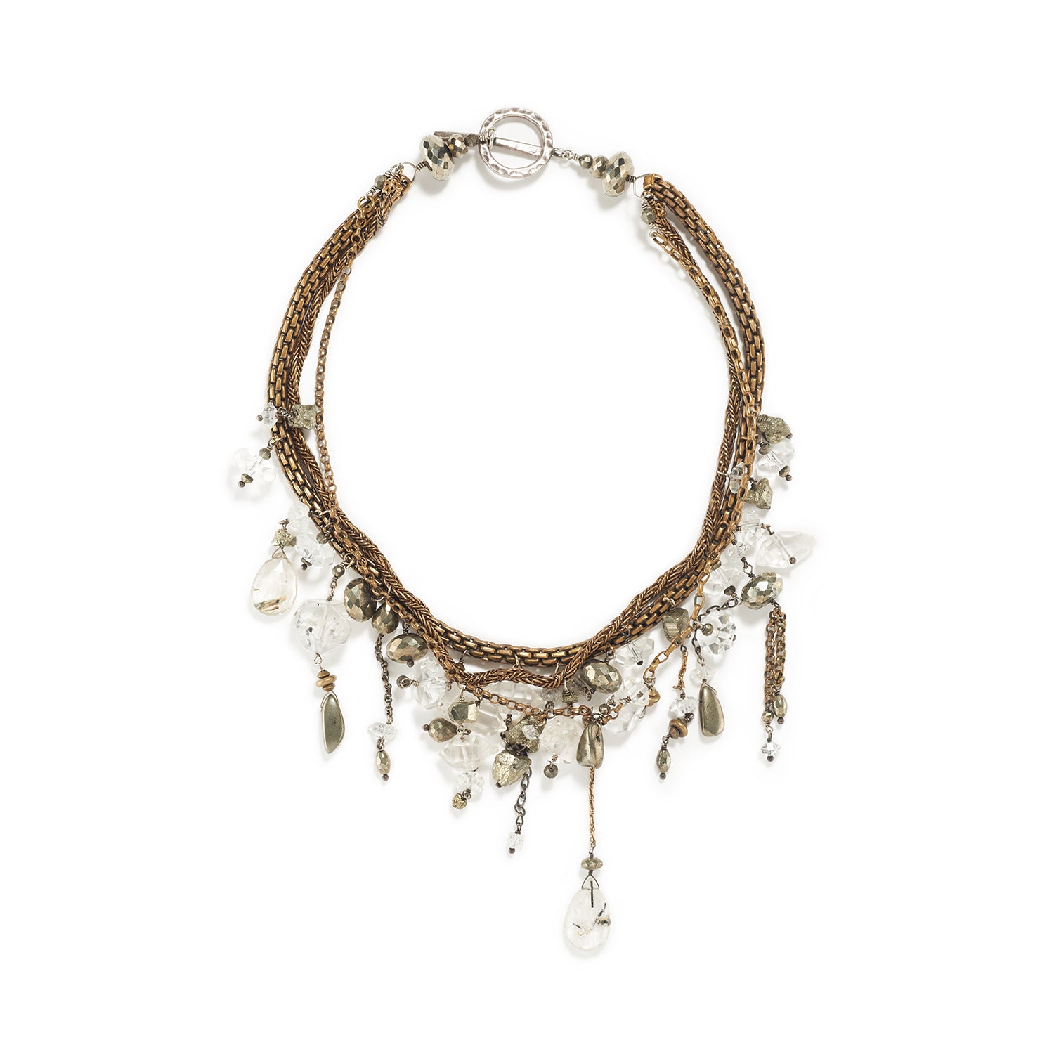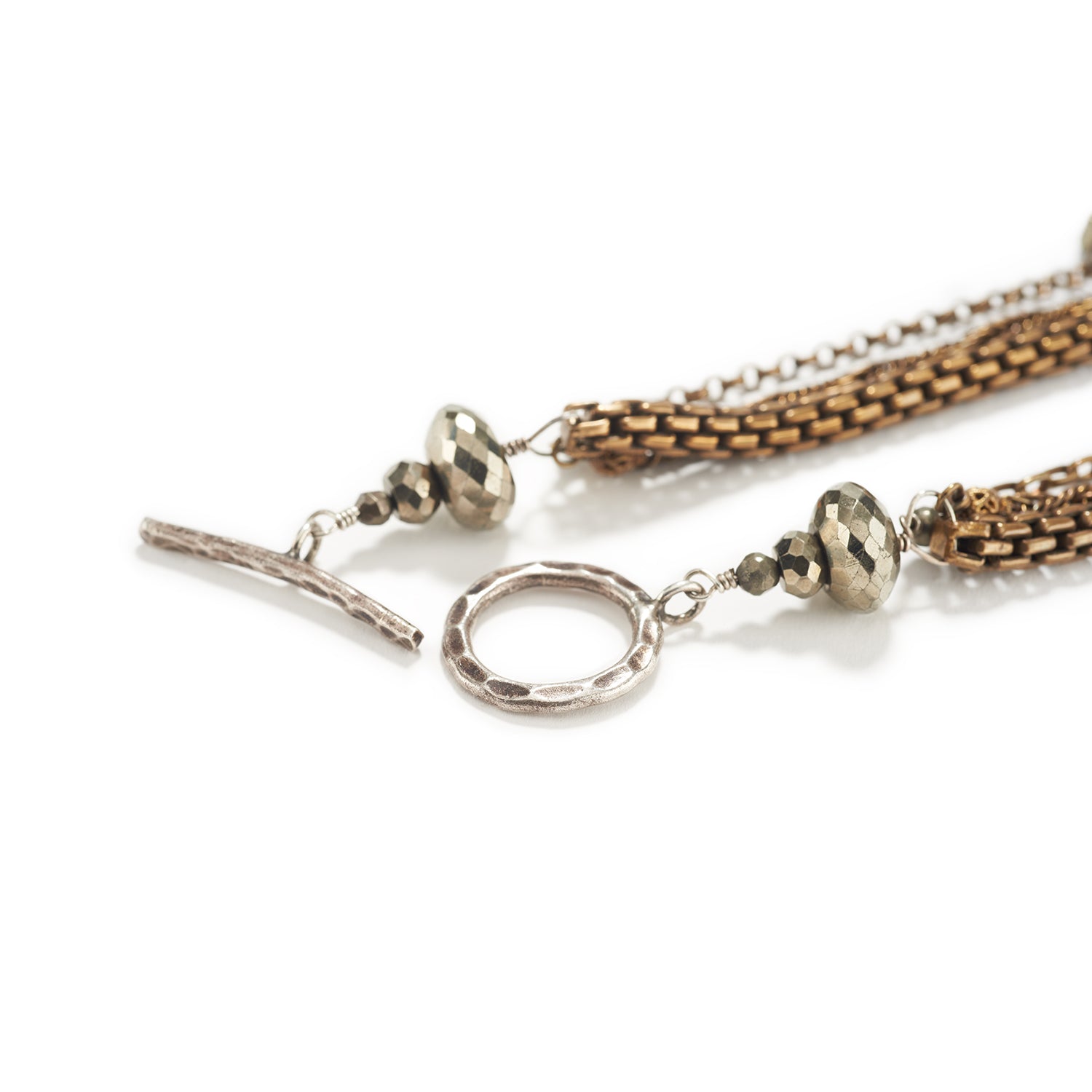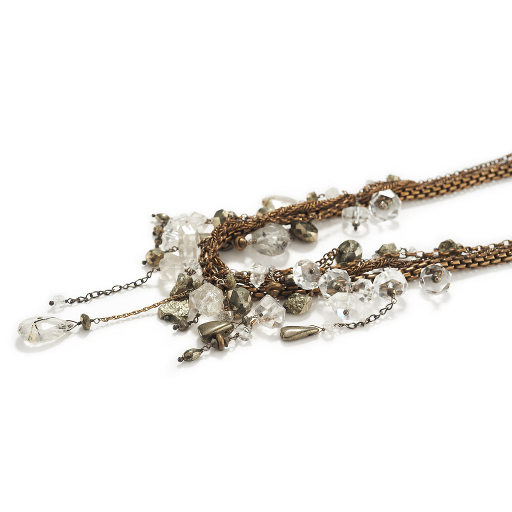 Vintage brass chain with quartz crystal, pyrite, and sterling silver