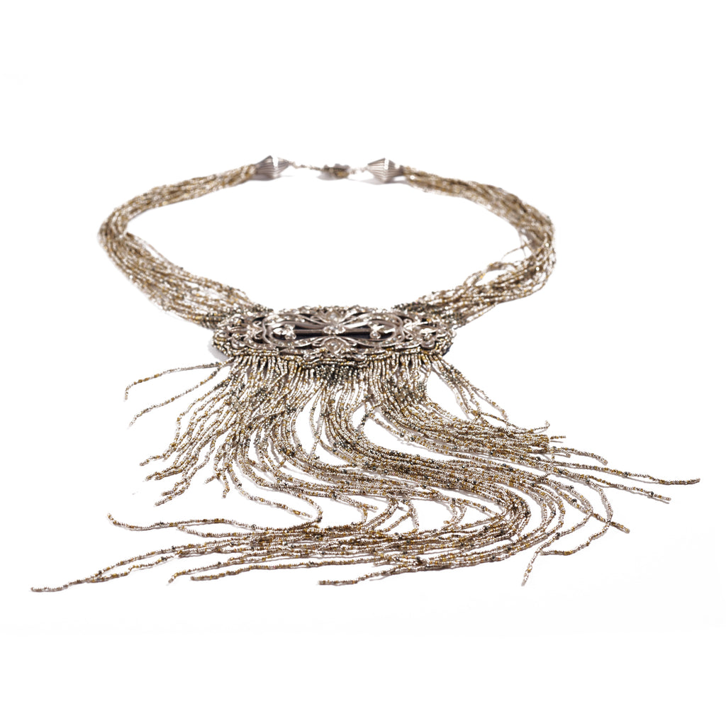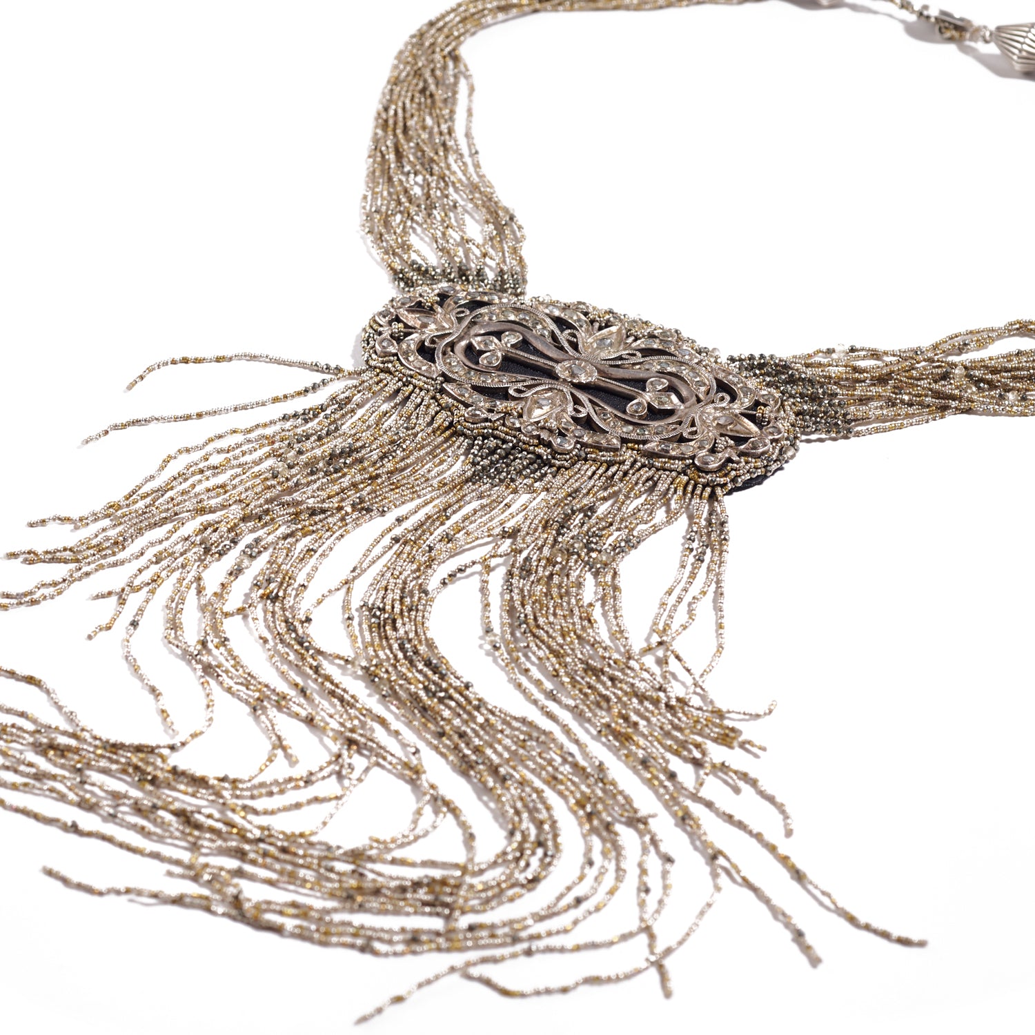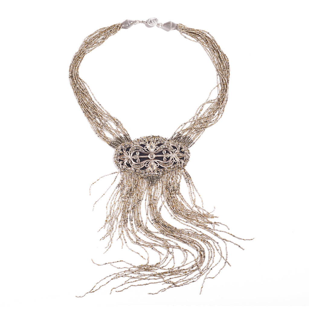 Antique silver, faceted Java diamonds, antique french brass beads, pyrite beads, quartz beads