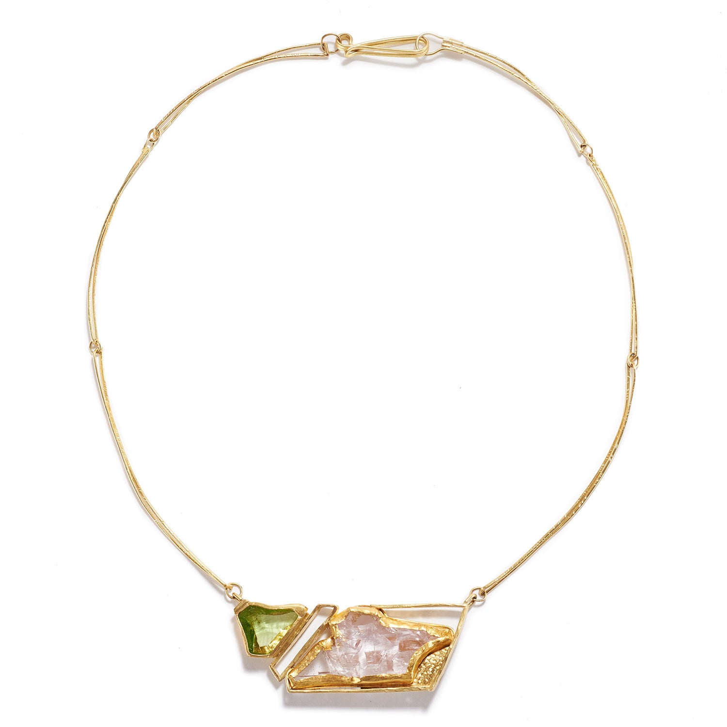 Like a whiff of early spring, this delicate pale pink Morganite surface crystal paired with a fresh peridot crystal is contained in a simple necklace. Alexandra sometimes catches colors and shapes that simply belong together, like two long-lost lovers. In this case, these pieces of peridot and morganite spoke to her. The jointed necklace and signature gold mounting add luster to the stones-and to the woman who wears them.