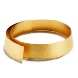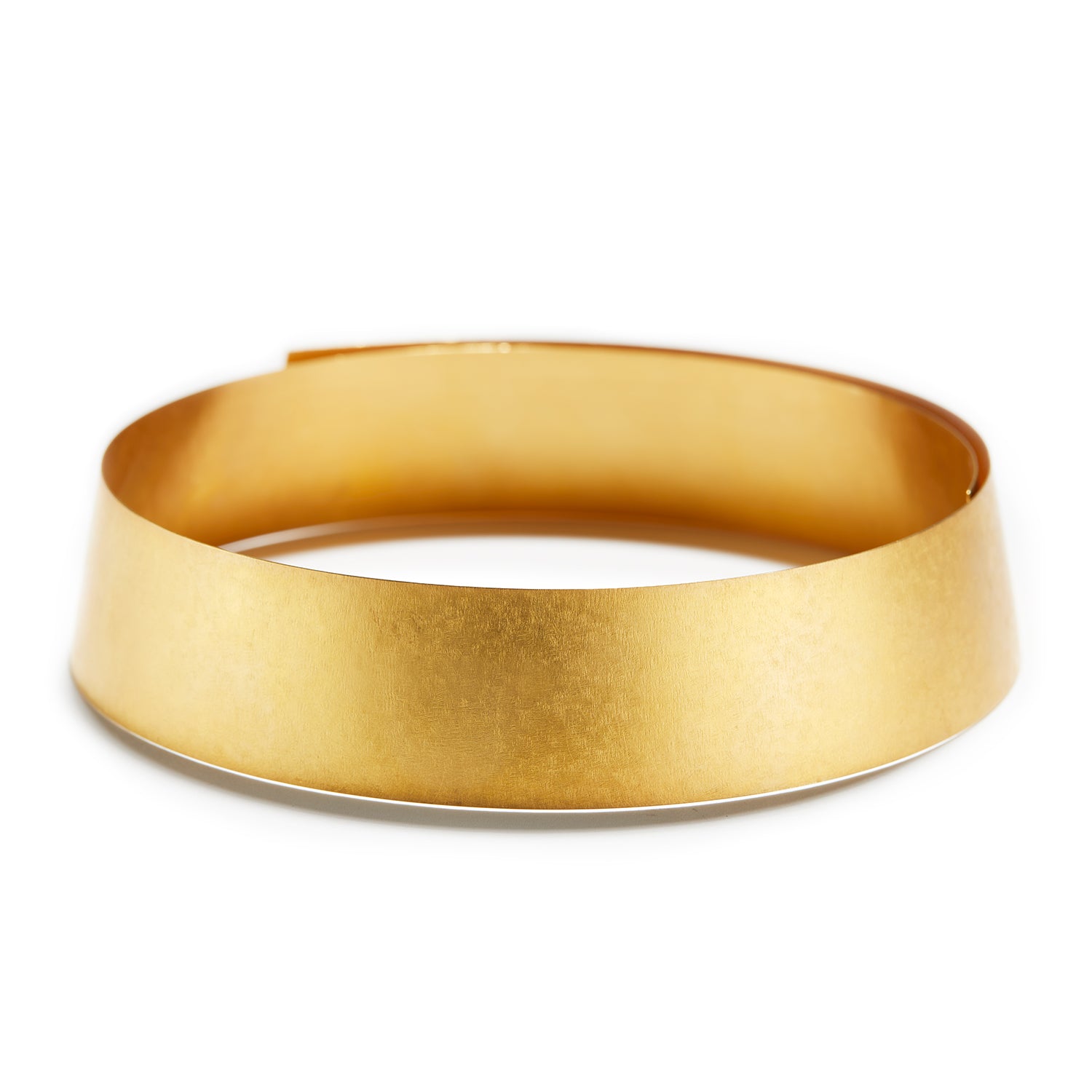 In simple, striking adornment, Ulla & Martin Kaufmann create a deceivingly straight-forward design in high karat gold. However, as true masters of their craft, the artists hammer gold to exacting tension and thickness. Ultimately, they procure what at first is an unfathomable expression in gold that evolves into a complex, multi-faceted work of art. Seamlessly, the piece wraps around the neck twice for a perfect fit. In every movement and sway in the light, admire it's perpetually gleaming disposition as its smooth surface becomes a natural extension of the body.
