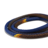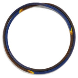 Brilliantly, the maker pairs a majestic combination of purple and brown, whereby to slowly climax to the beaming accents of yellow and burnt orange. From there, a splendid relief of deep purples and blues transpire, as if the dramatic iris petals in first bloom. As exceptionally elegant as they are dynamic, Kahn creates an impeccable work to naturally adorn the heart and season the soul.