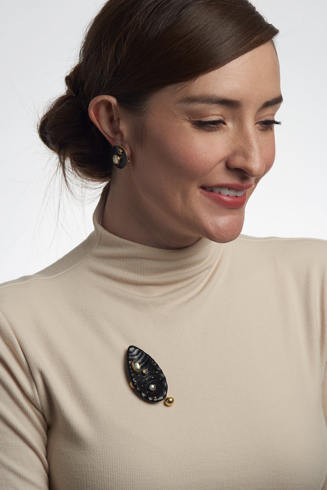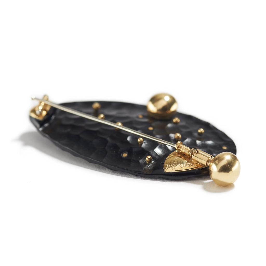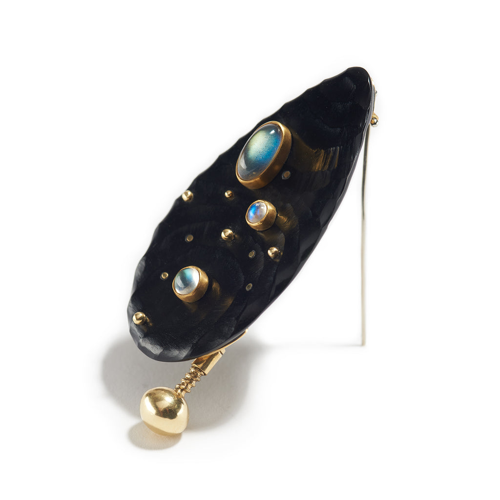 Carved black jade is the central element in this soft organic brooch, accented with floating moonstones set in 22K gold that move independently.