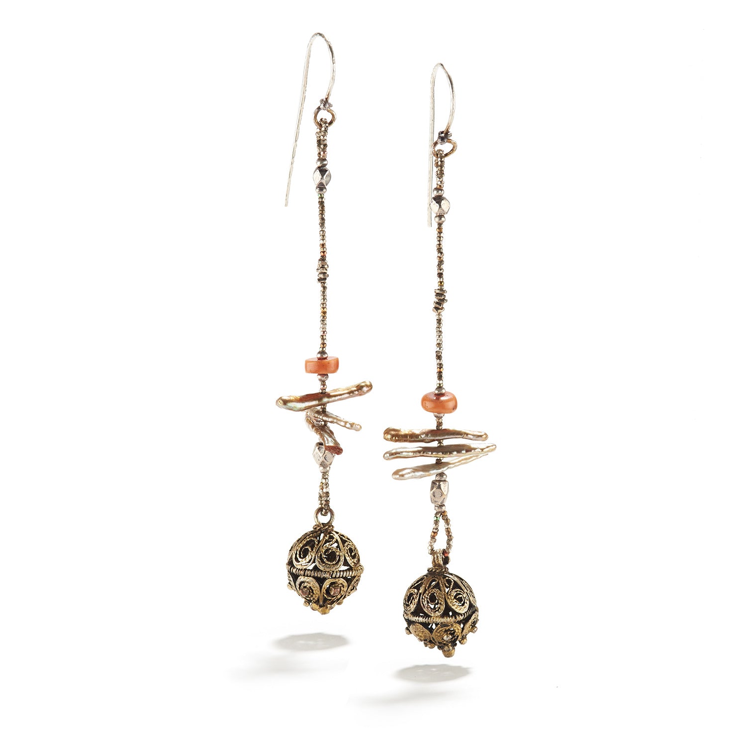 A rare opportunity to own a pair of earrings by legendary artist Lucia Antonelli, handmade with sterling silver ear wires and fall of antique beads with pearl, coral and filigree drops.