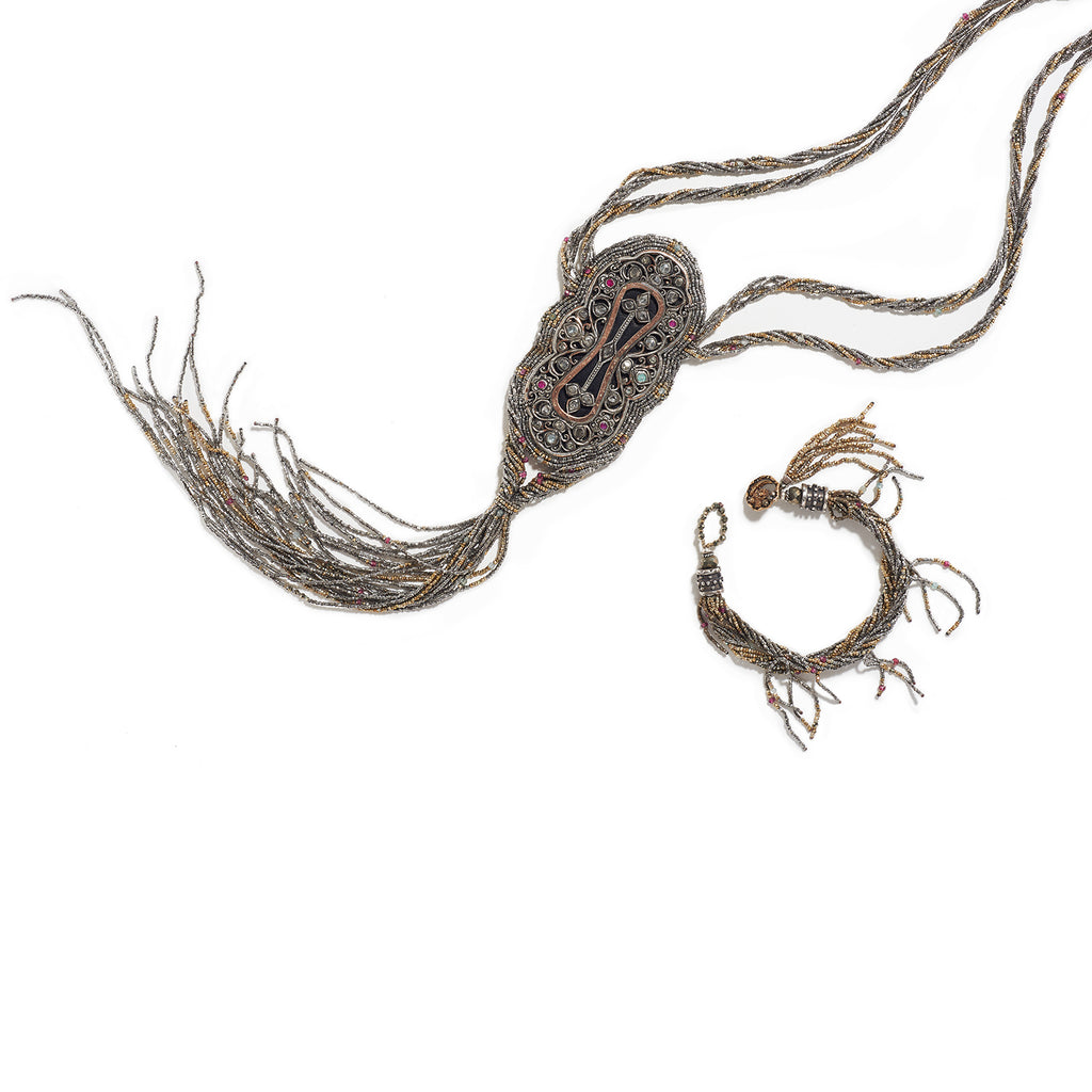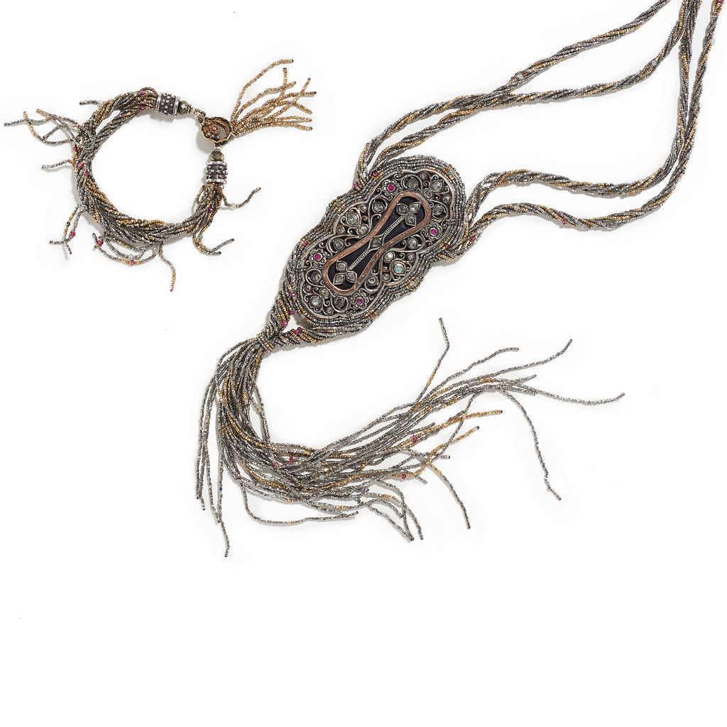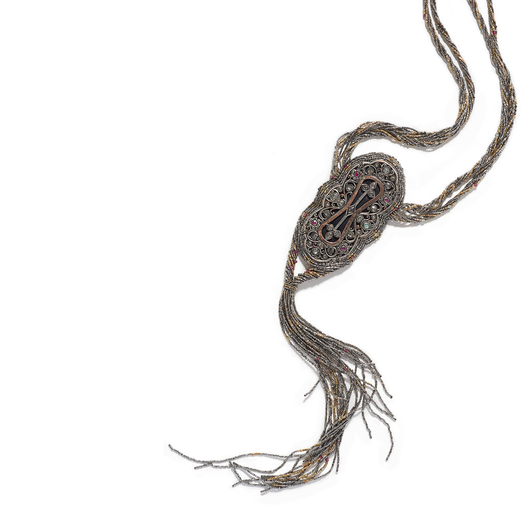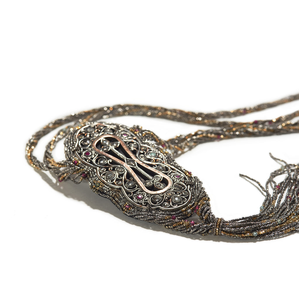 Regal decadence becomes a luscious mix of elegance and charm in Antonelli’s Your Royal Highness collection. Antique brass beads graciously meld together with cut steel in her complex compositions. At the heart of her talisman necklace is an amulet once worn in the 19th Century royal court of the Indonesian island of Java. Its ornate design arrests the soul with its vibrant whimsicality. Cast in silver, copper and gold, the object is further imbued with touches of diamond and sapphire. The wondrous hue of the gemstones are admirably reflected in the stitched river of beads that frame this bedizened piece. With deep thought and intention, Antonelli finishes the necklace as she coerces many tiny beads to travel in exacting progression, braided and draped for elegant shift and sway.