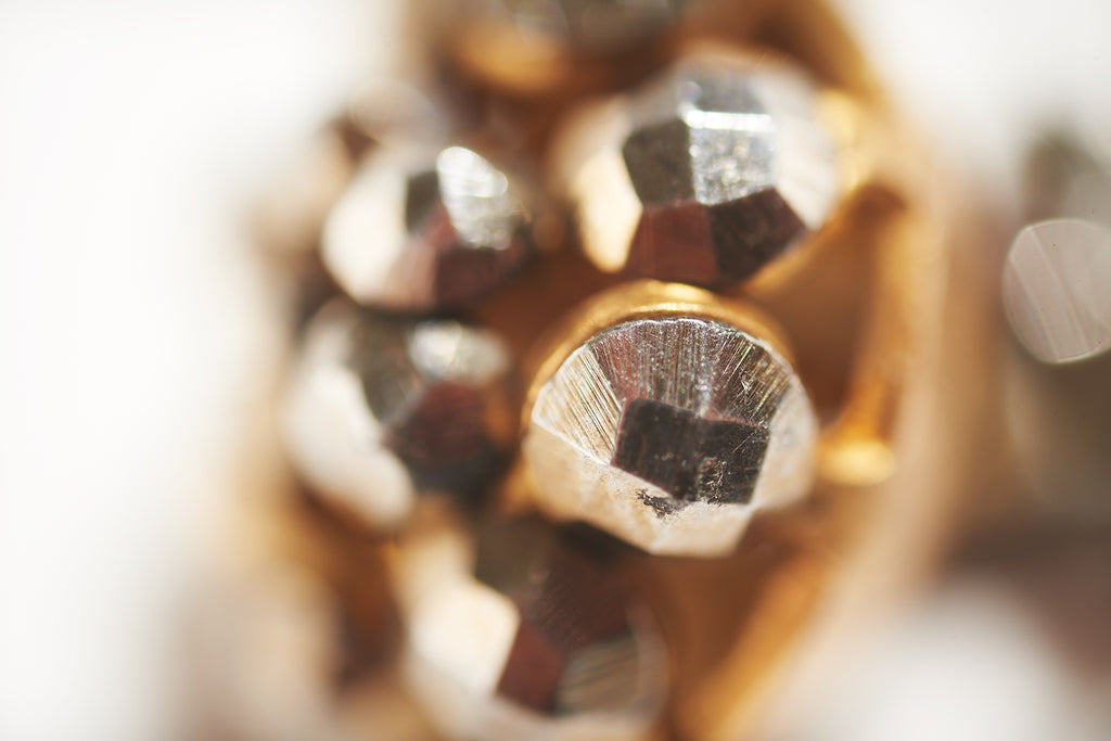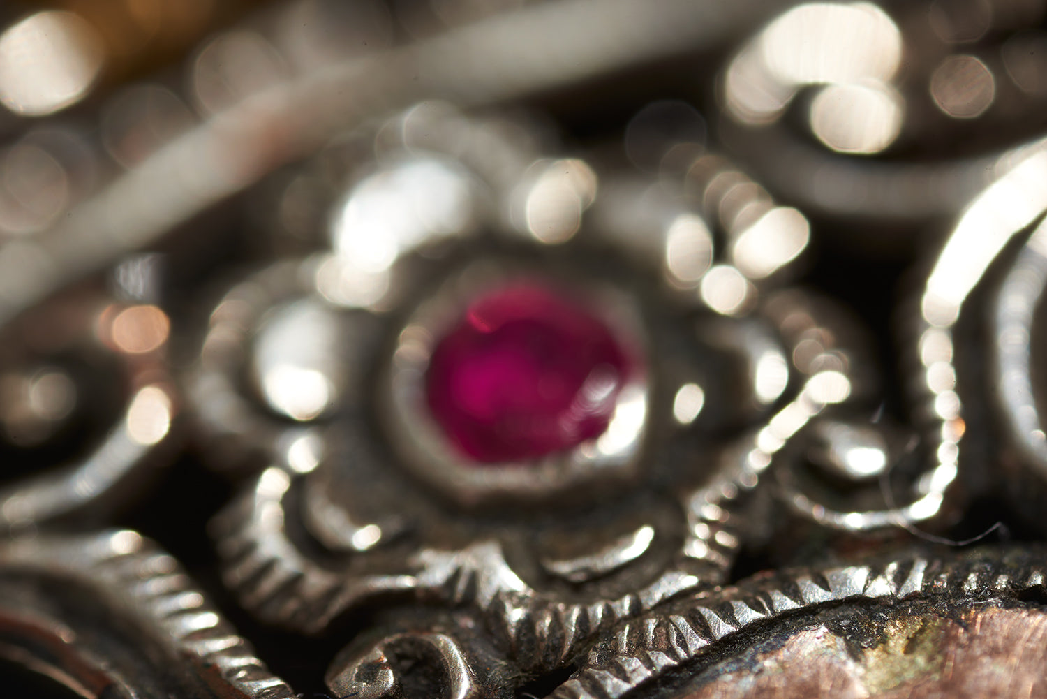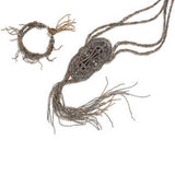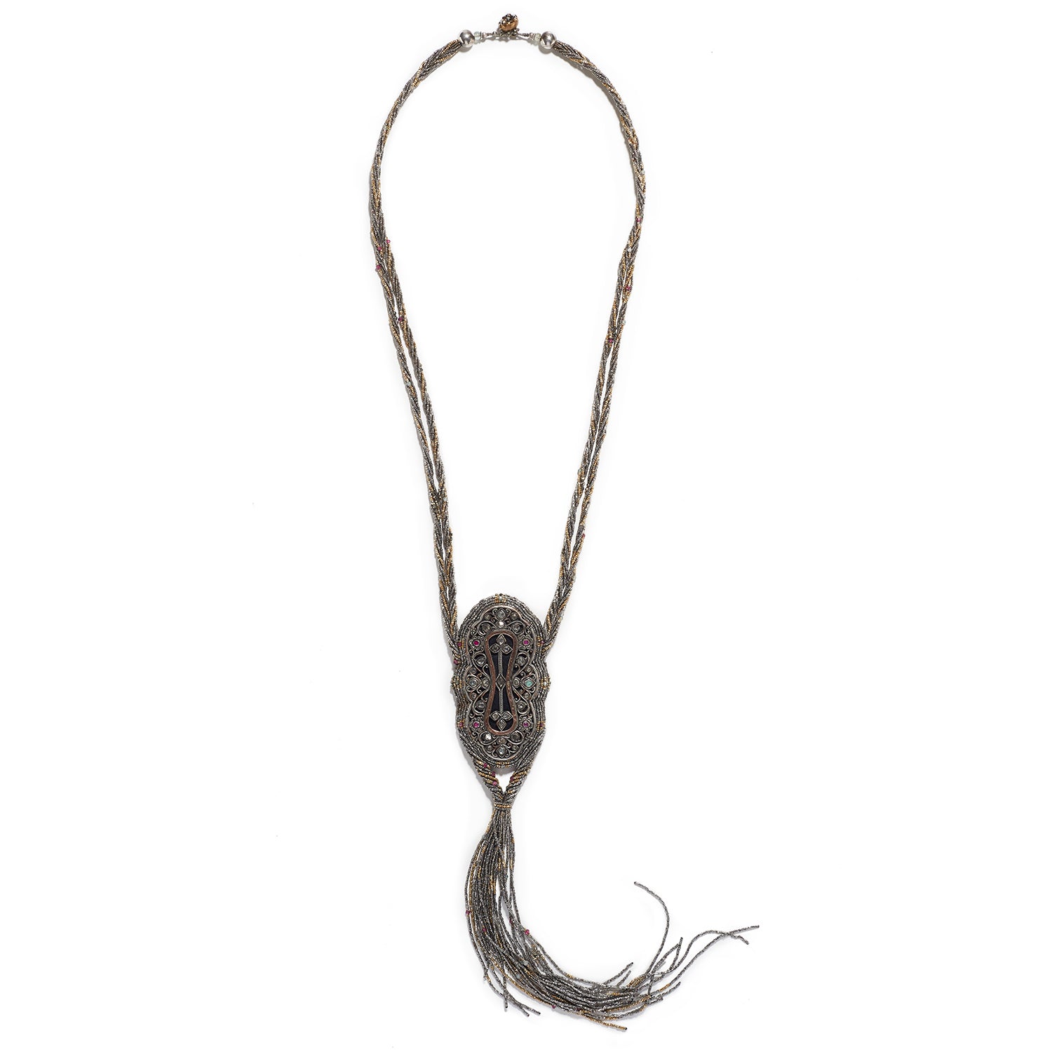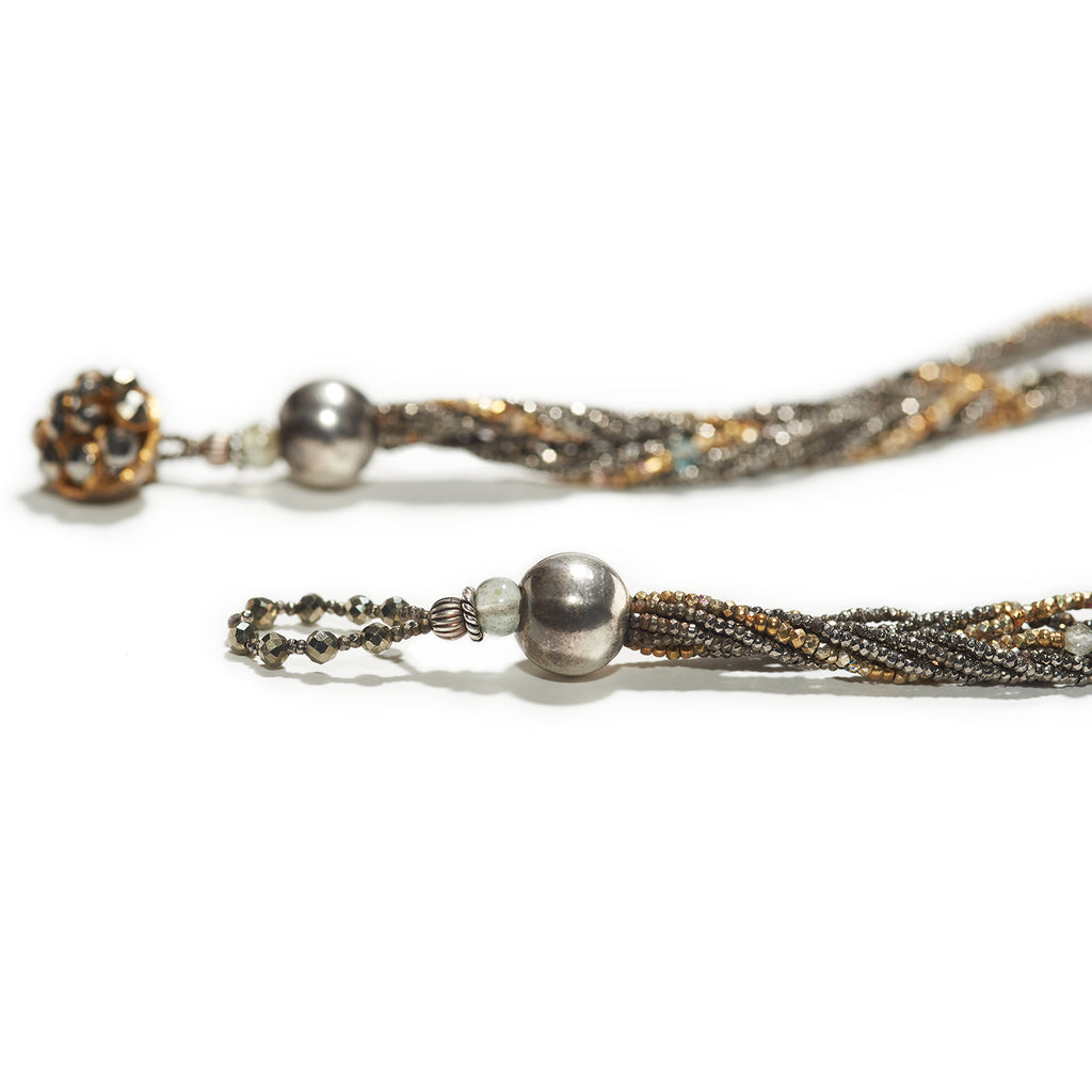 Regal decadence becomes a luscious mix of elegance and charm in Antonelli’s Your Royal Highness collection. Antique brass beads graciously meld together with cut steel in her complex compositions. At the heart of her talisman necklace is an amulet once worn in the 19th Century royal court of the Indonesian island of Java. Its ornate design arrests the soul with its vibrant whimsicality. Cast in silver, copper and gold, the object is further imbued with touches of diamond and sapphire. The wondrous hue of the gemstones are admirably reflected in the stitched river of beads that frame this bedizened piece. With deep thought and intention, Antonelli finishes the necklace as she coerces many tiny beads to travel in exacting progression, braided and draped for elegant shift and sway.