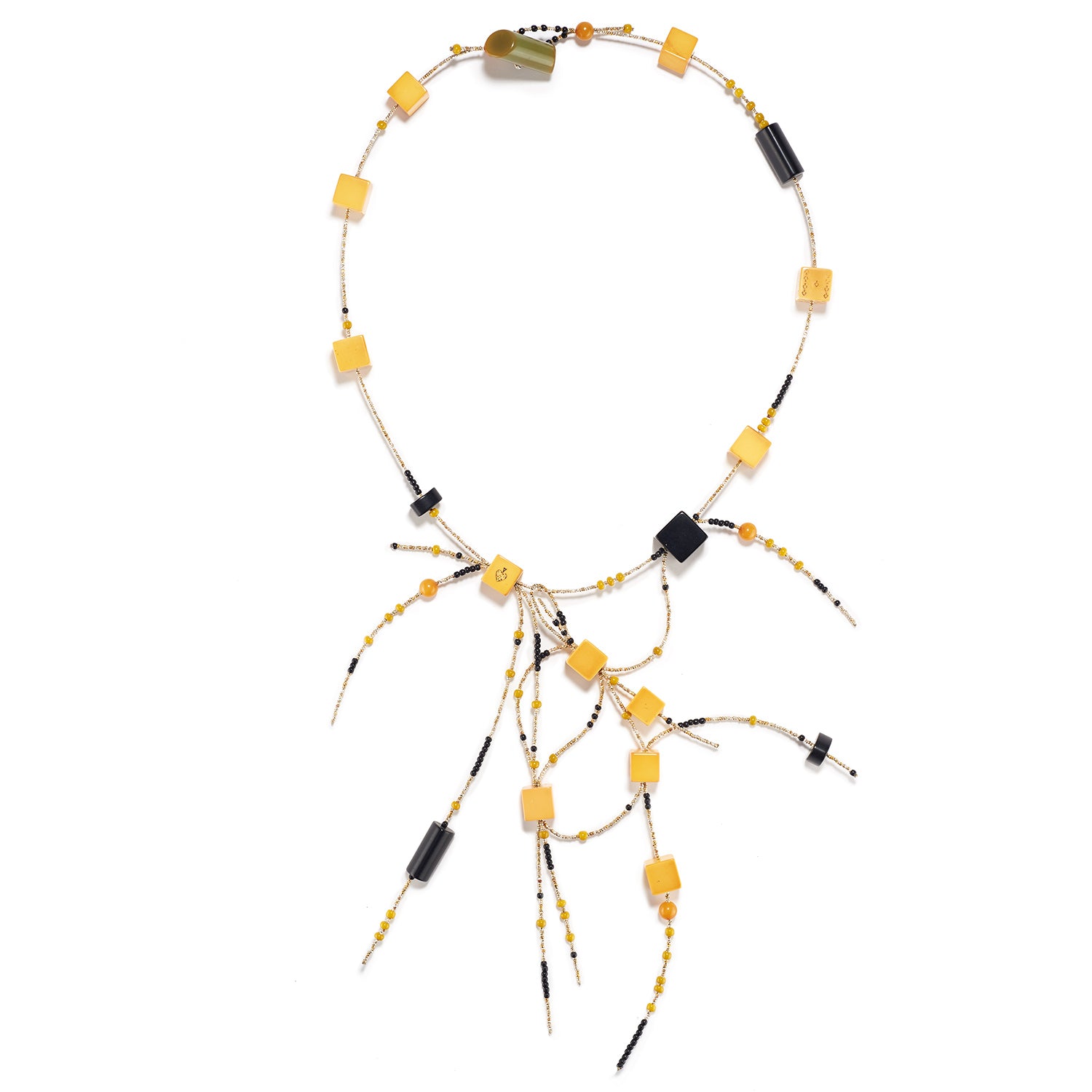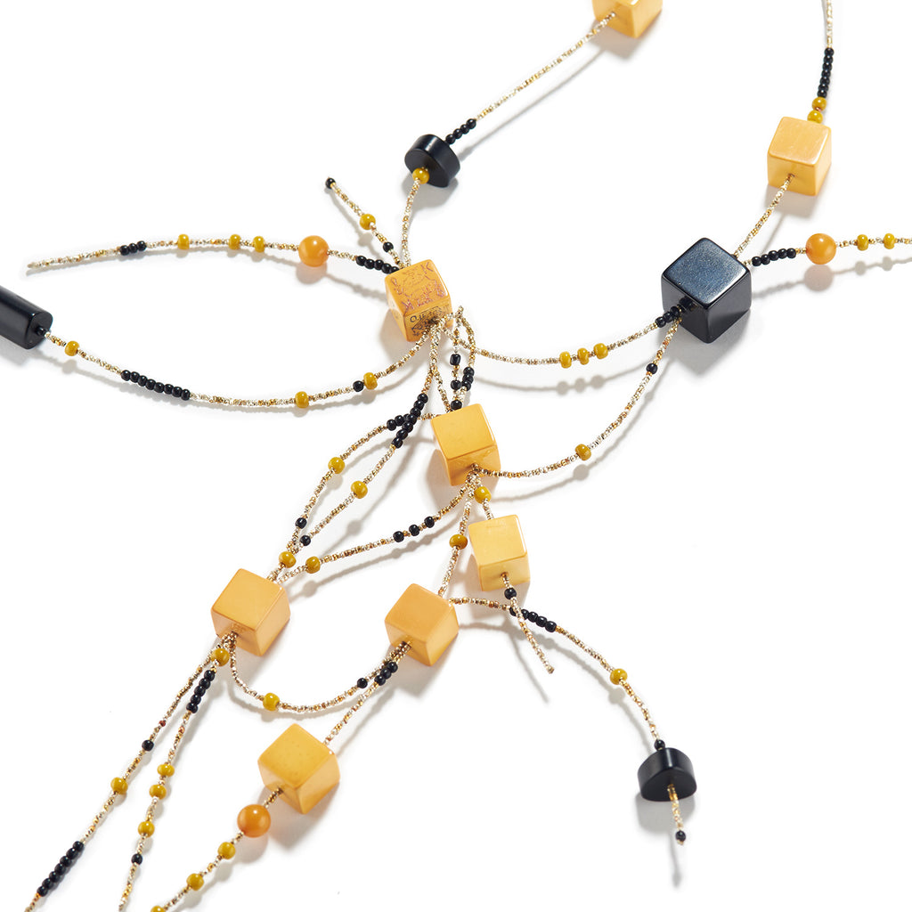 Single strand of antique French metal seed beads with small Bakelite cubes, yellow African glass, and black onyx accents